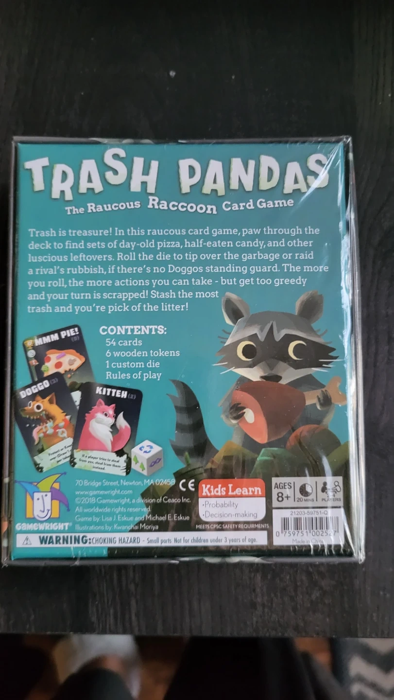 Trash Pandas is a card game for 2-4 players ages 8+. It includes 54 cards, 6 wooden tokens, 2 custom dice, and a rulebook. Players paw through the deck to find treasures and roll the dice to tip over garbage.