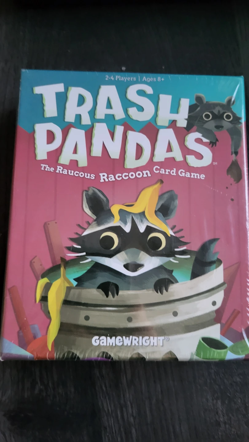 Trash Pandas is a card game for 2-4 players ages 8+. It includes 54 cards, 6 wooden tokens, 2 custom dice, and a rulebook. Players paw through the deck to find treasures and roll the dice to tip over garbage.