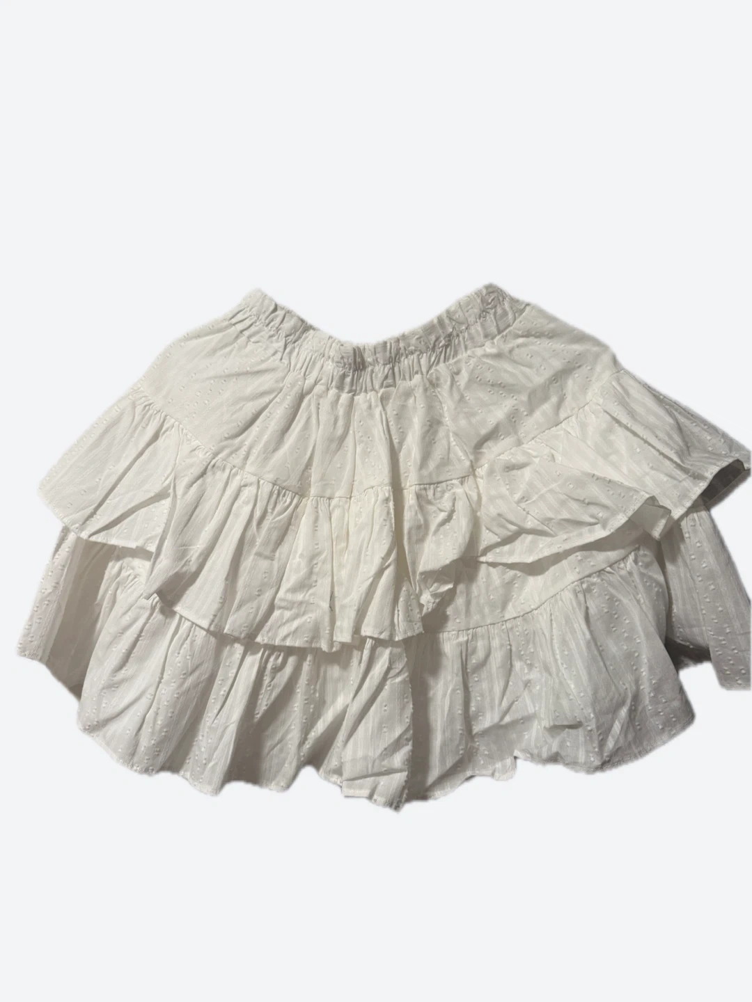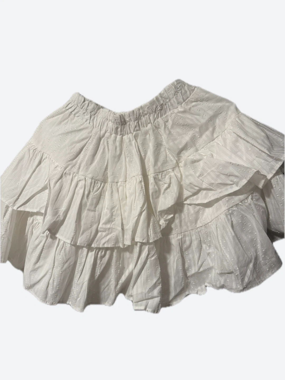 Selling a cute white ruffled mini skirt! It's in great condition and perfect for summer. The skirt features multiple layers of ruffles and has an elastic waistband for a comfortable fit