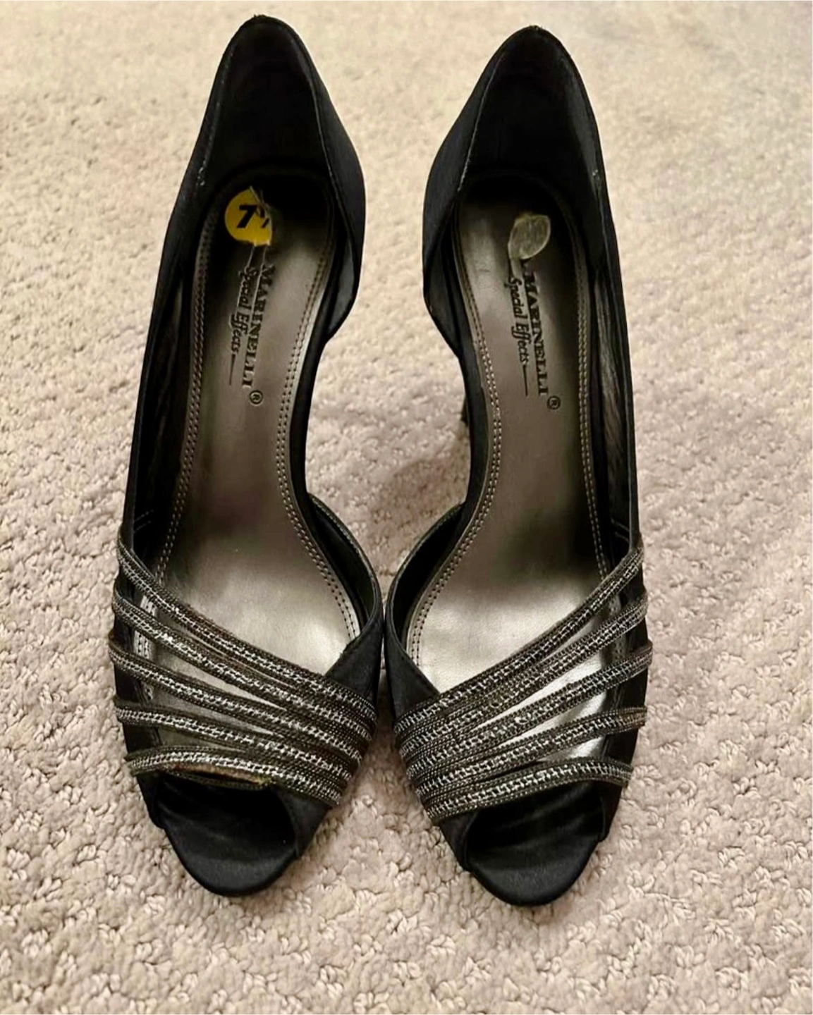 Selling a pair of Martinelli Special Effects black heels in size 7.5. They feature a stylish design with silver detailing. Perfect for a night out or a special occasion!