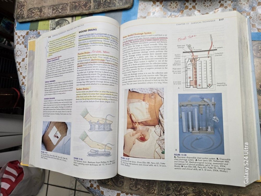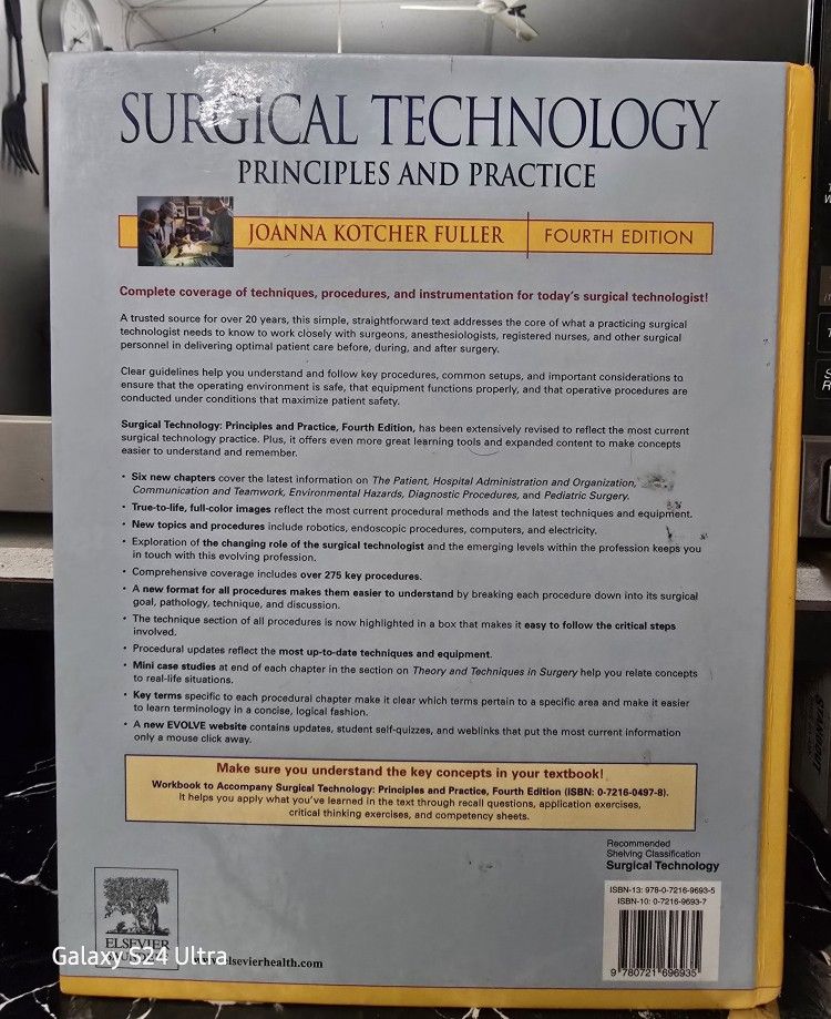 This is the "Surgical Technology Principles and Practice Fourth Edition" textbook, published by Elsevier-Health Sciences Division. It's a comprehensive resource for those studying or working in nursing and surgery. Authored by Joanna Kotcher Fuller, this revised edition has 1008 pages. It's a hardcover with dimensions of 10.9" L x 8.5" W x 2" H. The book is used, and there are written notes and references visible on multiple pages.