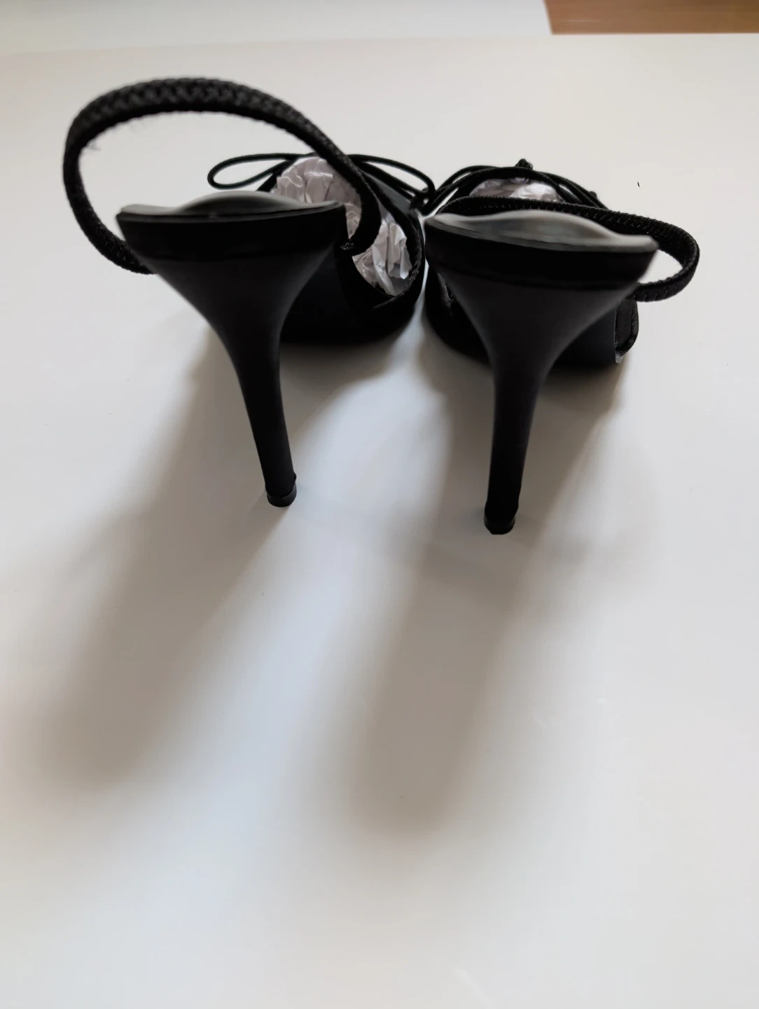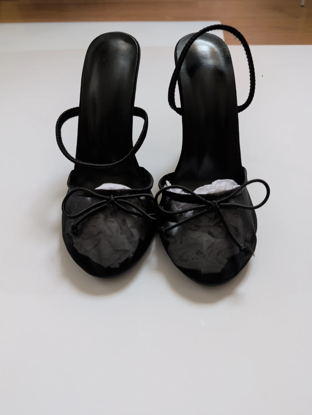 Stylish black slingback heels with a delicate bow accent on the toe. Features a secure ankle strap and a comfortable heel height. These heels are perfect for adding a touch of elegance to any outfit, from casual to formal occasions.