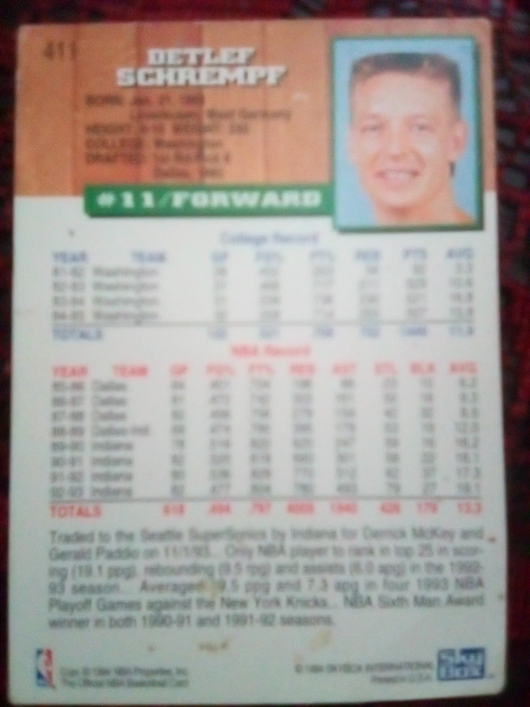 This is a 1991-92 NBA Hoops basketball card featuring Detlef Schrempf. Schrempf played for the Indiana Pacers during this era. The card details his college and NBA stats. It also notes his trade to the Seattle SuperSonics in 1993 and his NBA Sixth Man Award wins.