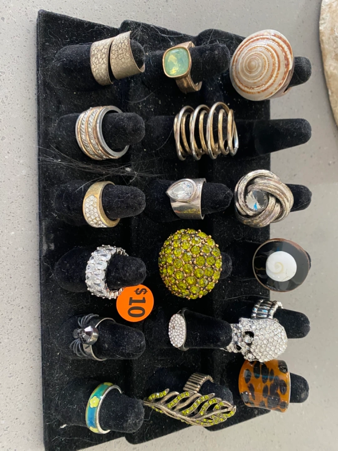 A collection of unique fashion rings, perfect for adding flair to any outfit. This set includes various styles, from sparkling stones to decorative designs. Great for personal use or as a gift!