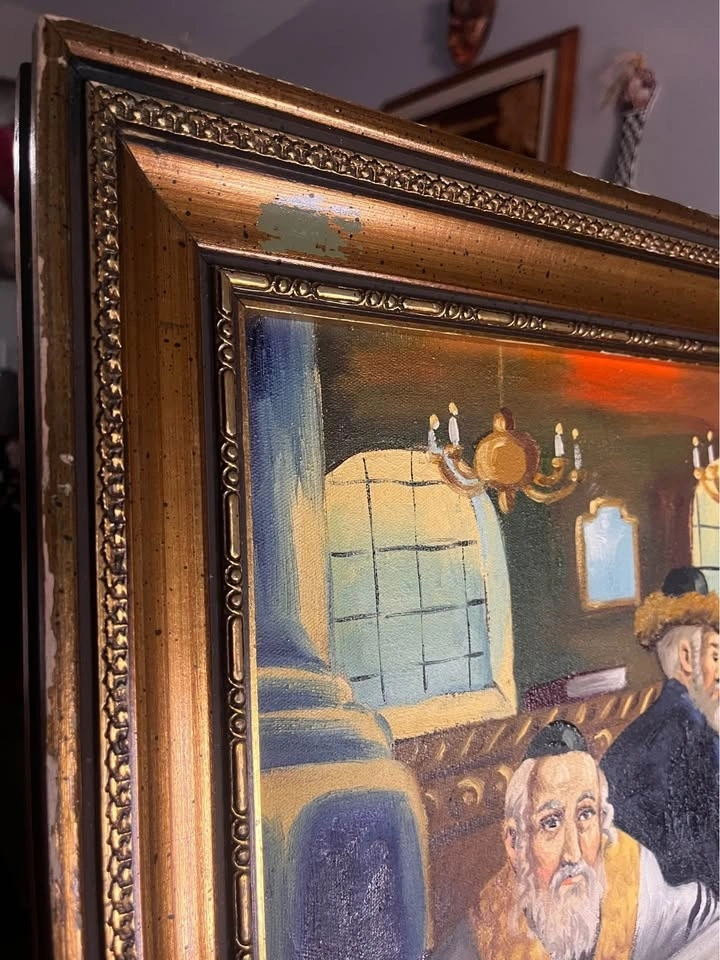 Vintage Judaica oil painting of Jewish Rabbis with Star of David Symbol on canvas. Signed by the artist B. Sade. 32x24 inches (including frame, see pictures for detail). Pre-owned vintage good condition, with light wear appropriate to age. Please understand that these are previously loved vintage items and will not be new. The word vintage means the condition reflects the age and wear and tear that you might expect.