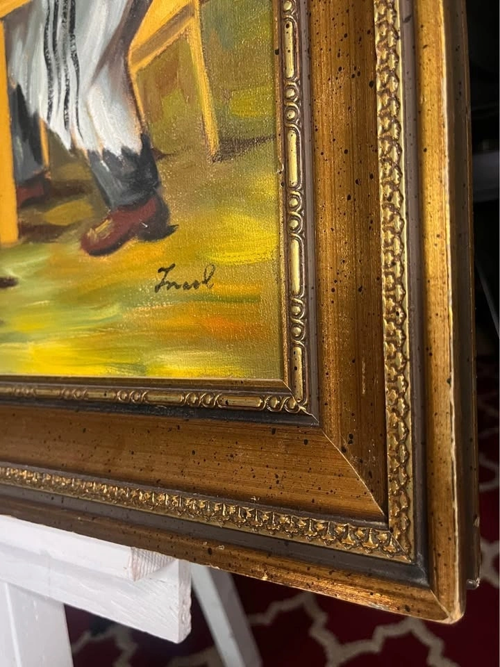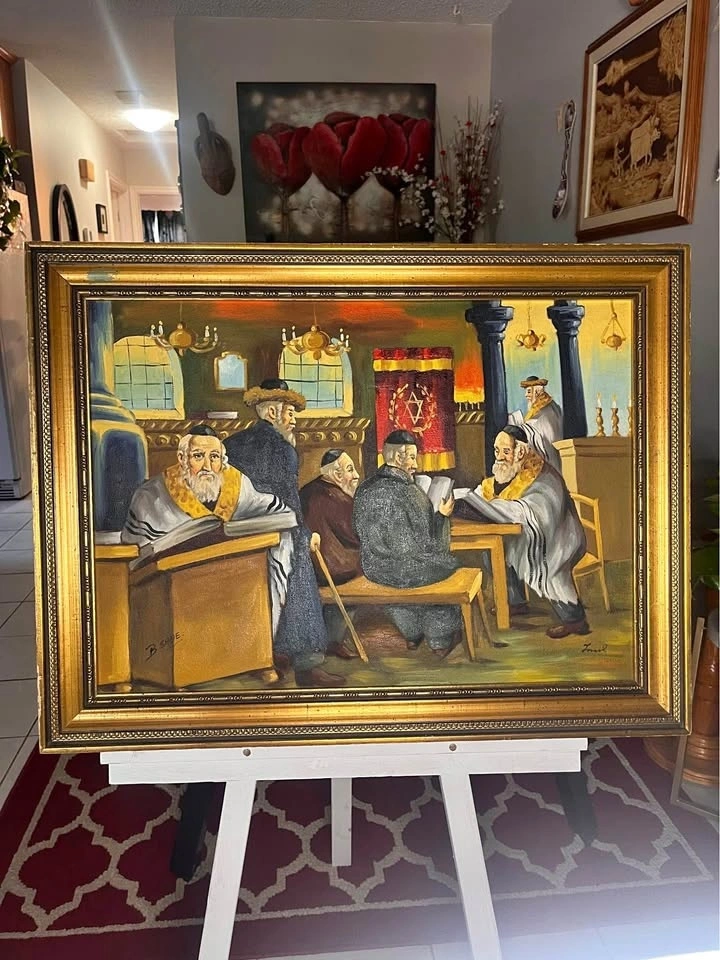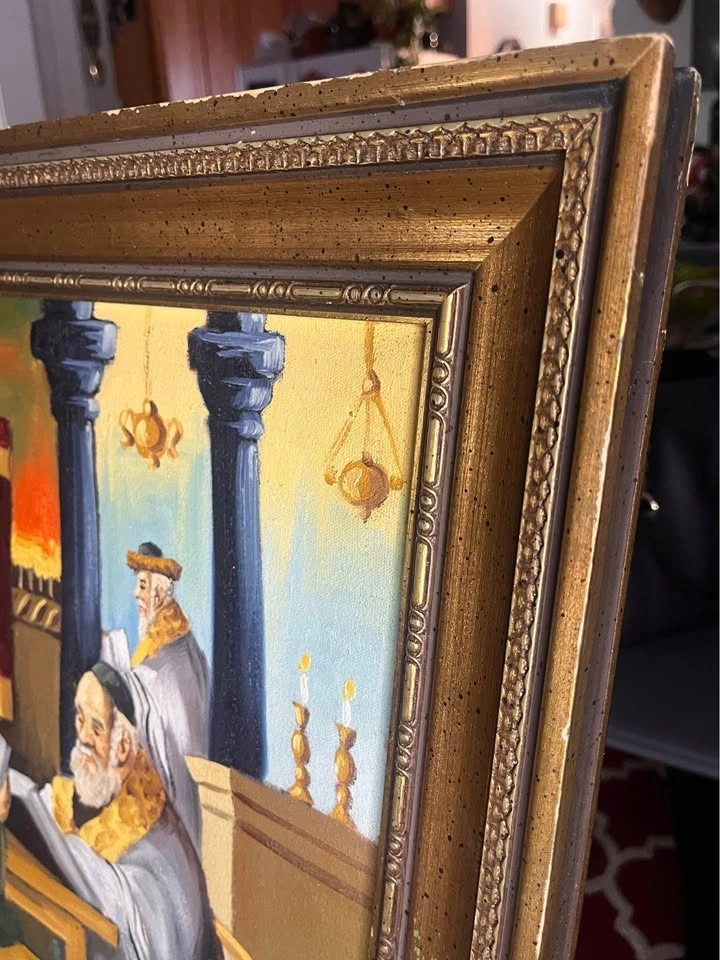 Vintage Judaica oil painting of Jewish Rabbis with Star of David Symbol on canvas. Signed by the artist B. Sade. 32x24 inches (including frame, see pictures for detail). Pre-owned vintage good condition, with light wear appropriate to age. Please understand that these are previously loved vintage items and will not be new. The word vintage means the condition reflects the age and wear and tear that you might expect.