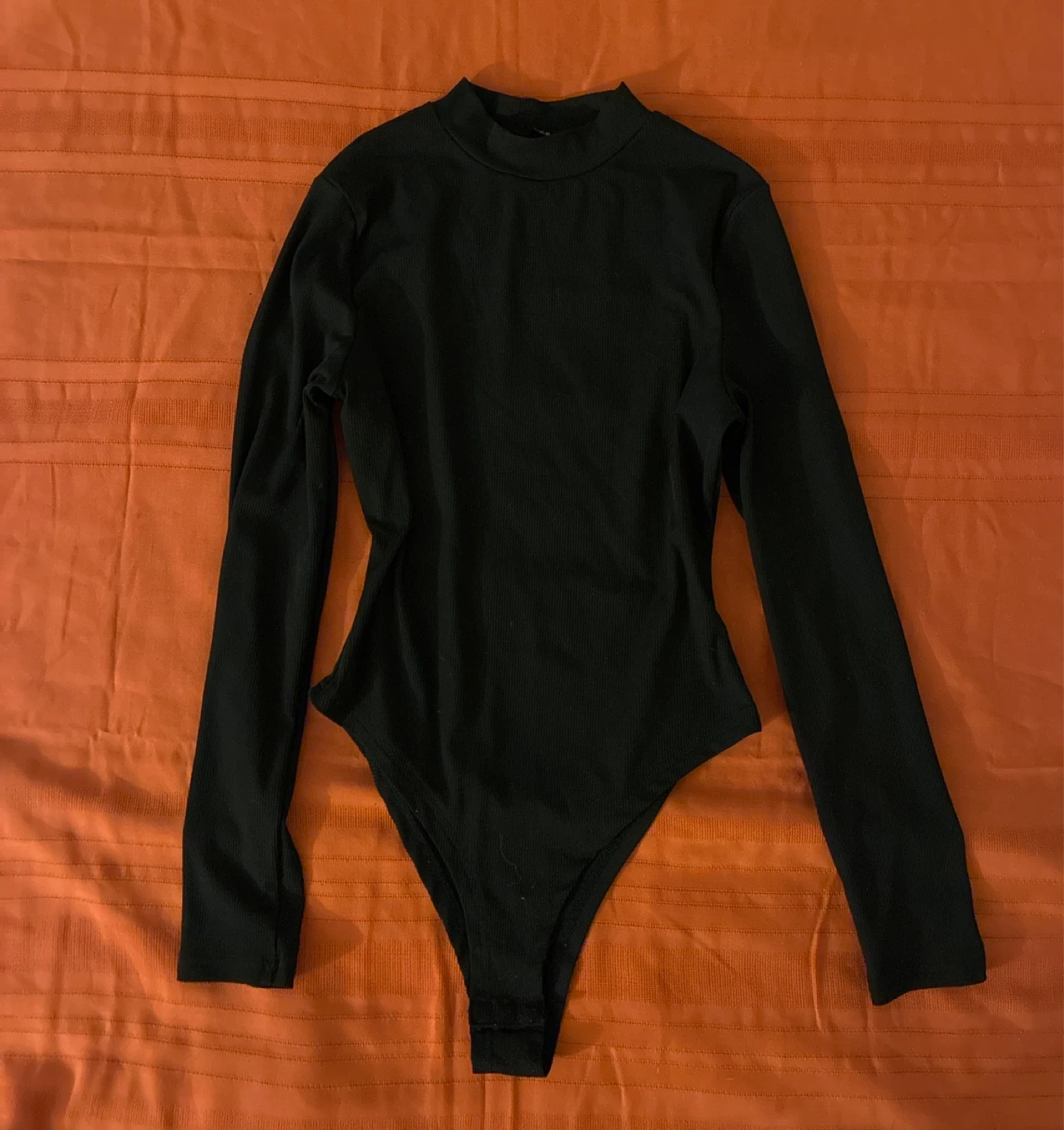 This black bodysuit features a ribbed texture and a mock neck design. It has long sleeves and a thong bottom with snap closure. The material is stretchy and comfortable.