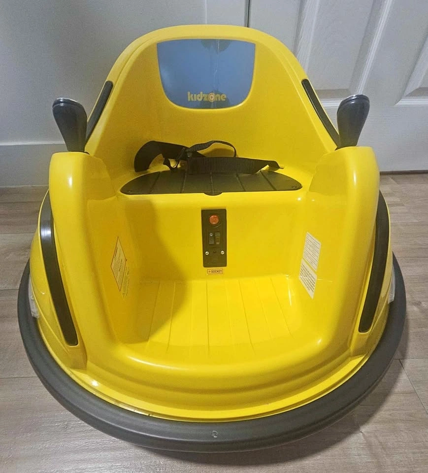 Awesome Kidzone electric bumper car in bright yellow. It has working lights around the base and a Bluetooth mode so you can easily hook up your phone and play music. Comes with a seatbelt for safety and a charger. My son hasn't shown much interest in riding it, and we don't have the space to keep it if it's not being used. Feel free to message if you have any questions! Cash Only.