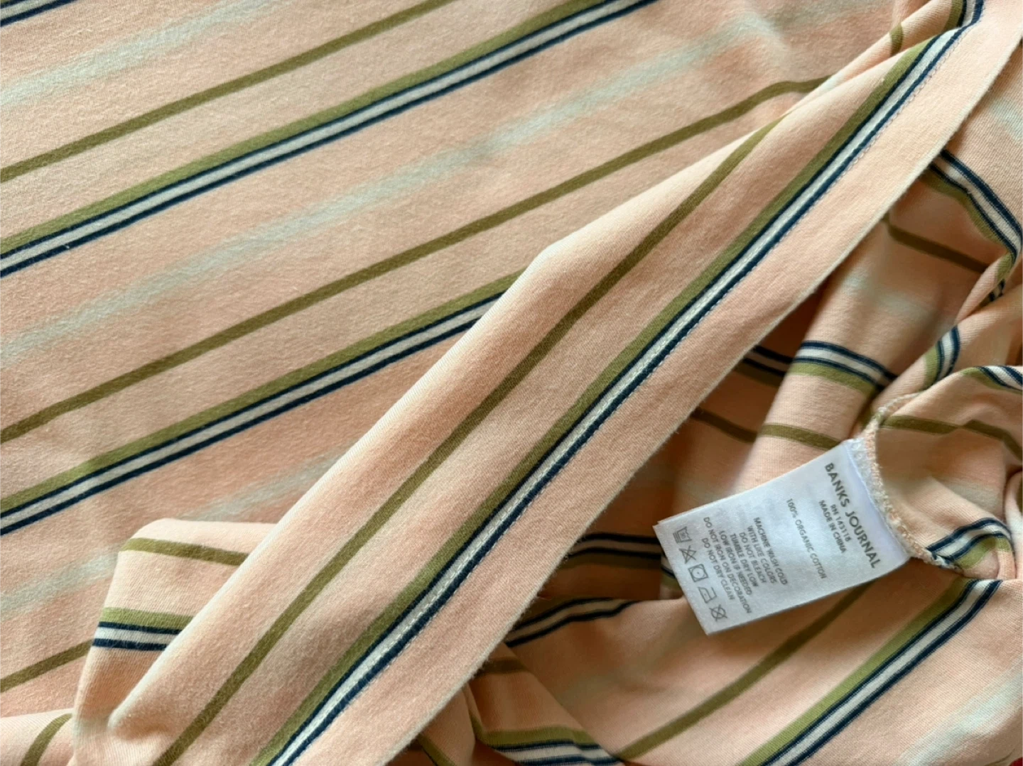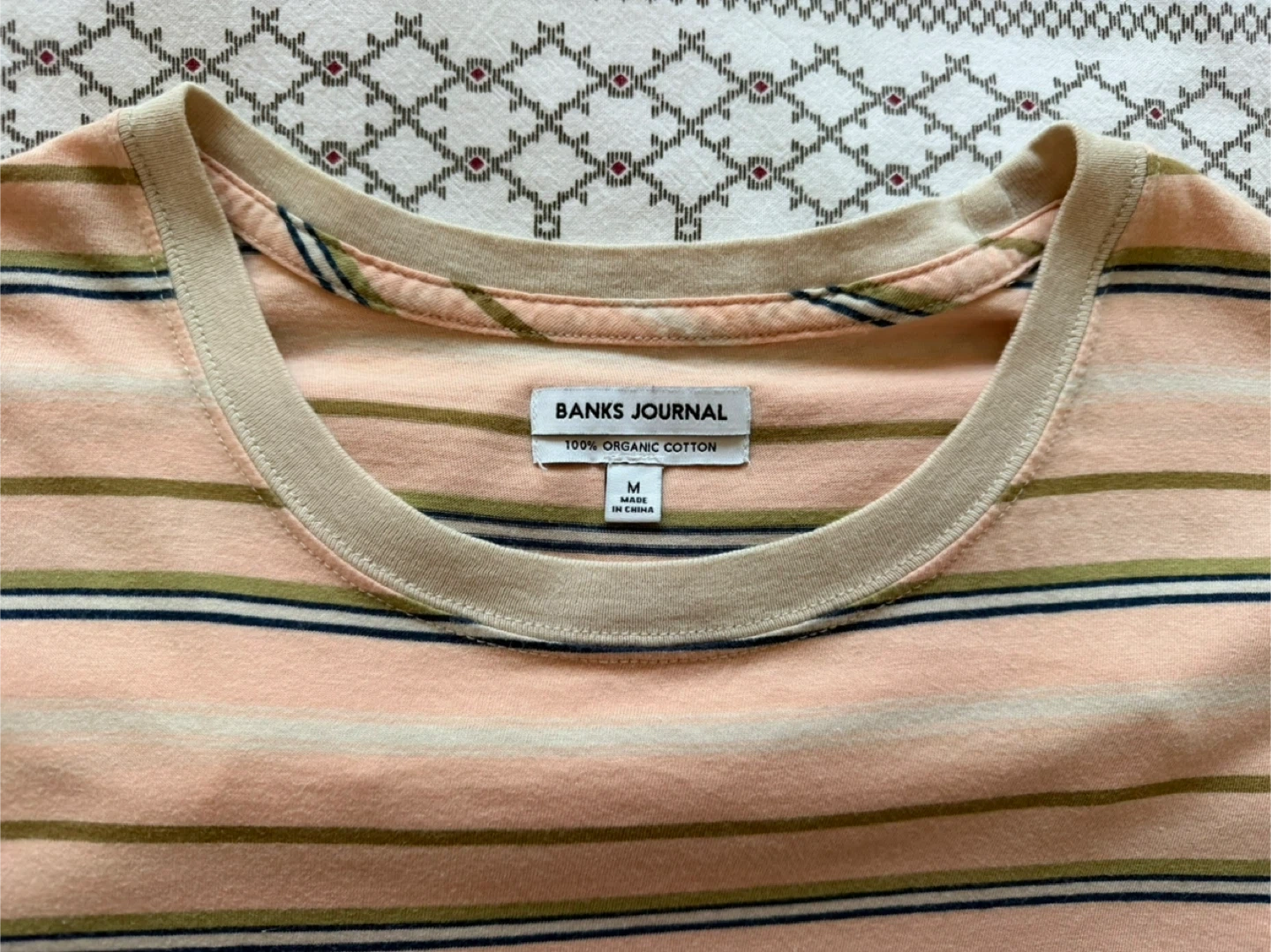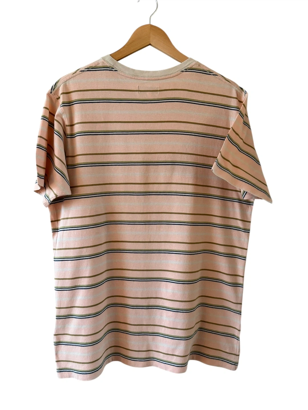 Banks Journal t-shirt in a size medium. Made from 100% organic cotton. Features a pastel stripe pattern with tan, olive, and navy accents on a light pink base. Crew neck and short sleeves. It's a comfortable everyday tee.