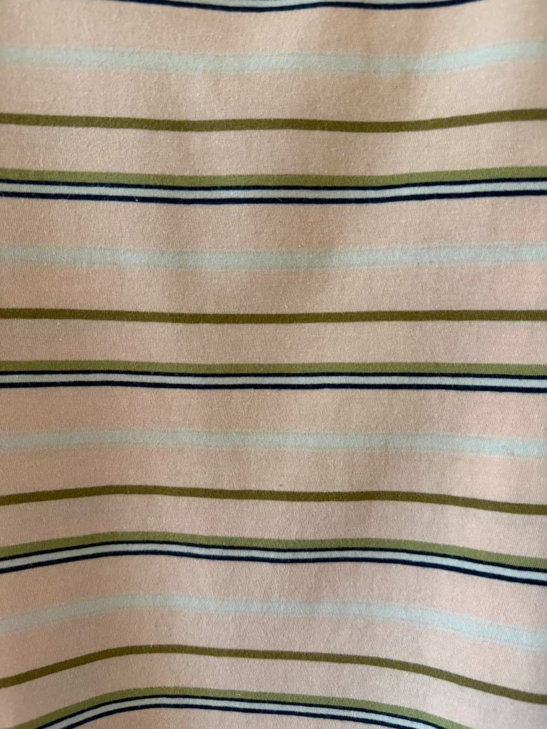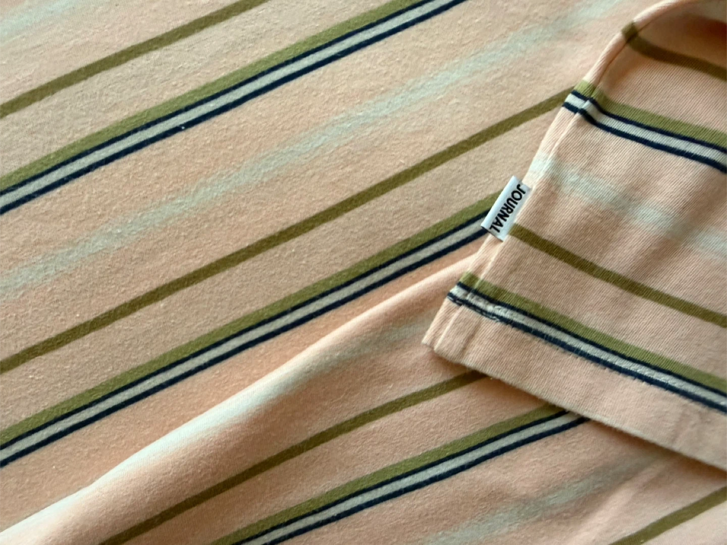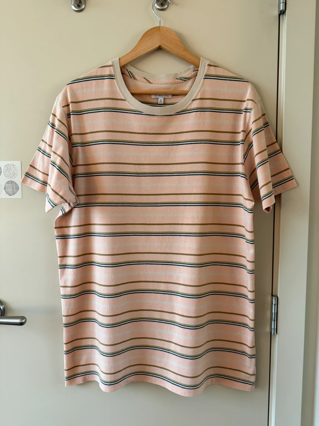 Banks Journal t-shirt in a size medium. Made from 100% organic cotton. Features a pastel stripe pattern with tan, olive, and navy accents on a light pink base. Crew neck and short sleeves. It's a comfortable everyday tee.