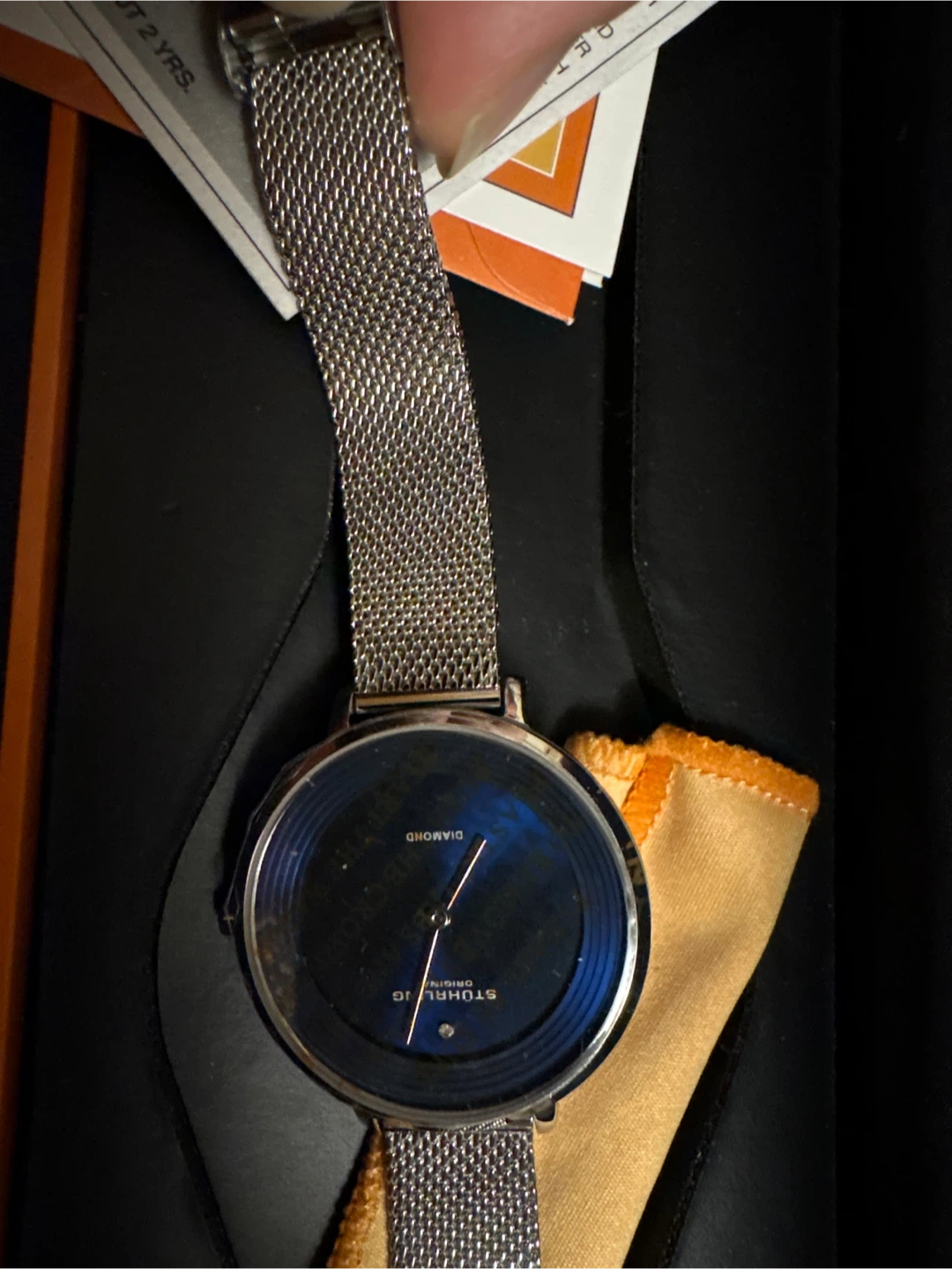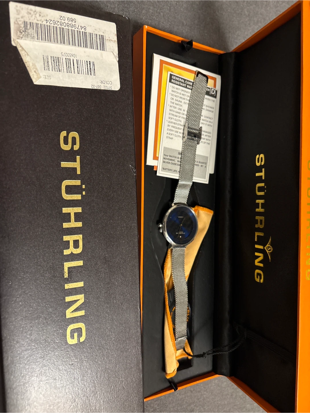 Selling a Stührling Original watch in excellent condition! It comes with its original box and a soft cleaning cloth. This stylish timepiece features a sleek silver band and a striking blue face. Perfect for adding a touch of elegance to any outfit!