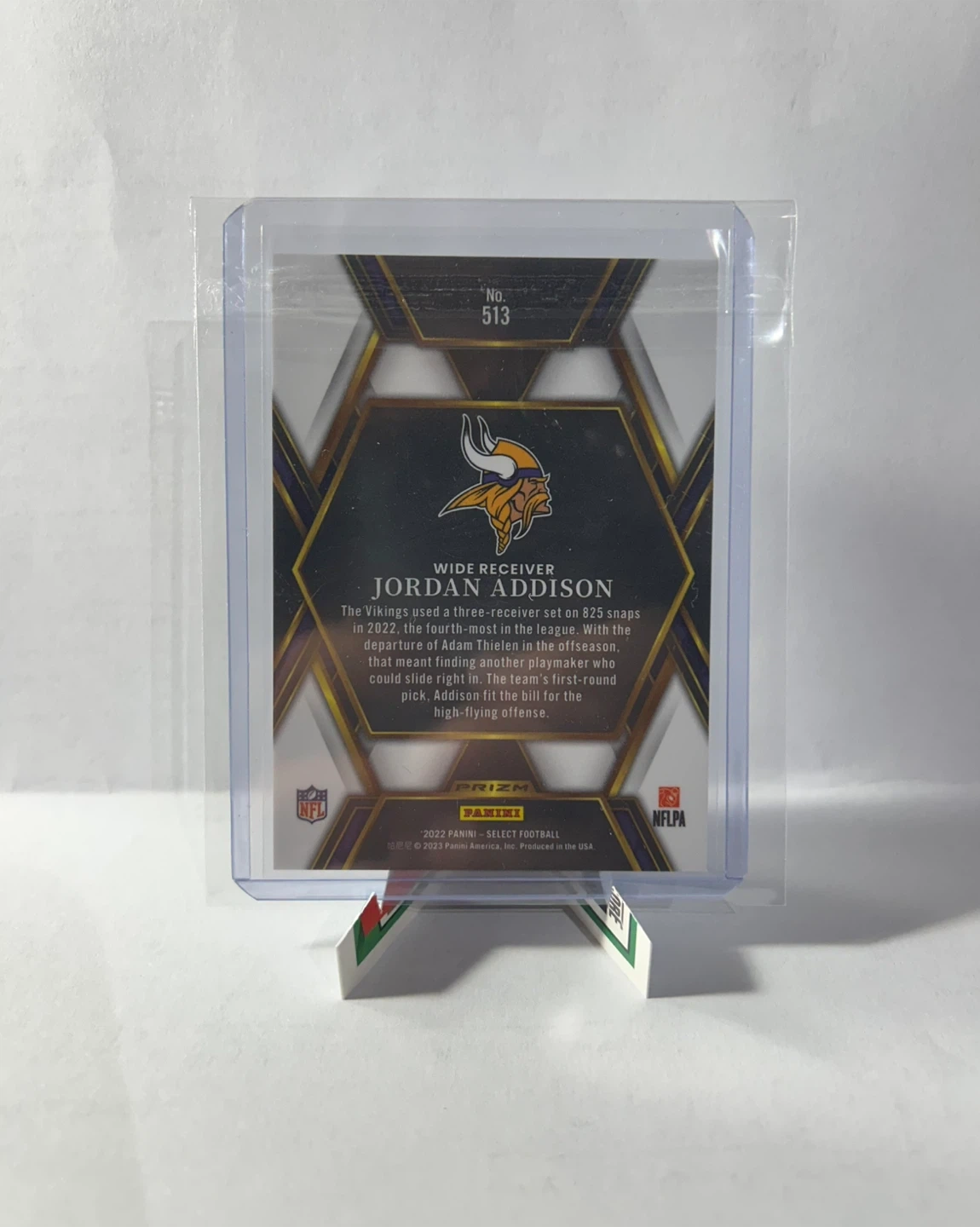 This is a 2022 Panini Select Football card featuring Jordan Addison. The card is numbered 513 and is a Prizm insert redemption card. It's a great addition for any Vikings or Jordan Addison fan!