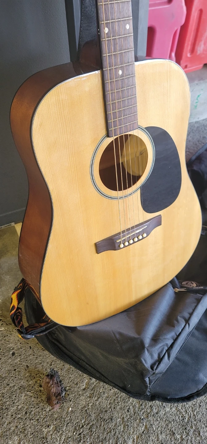 Acoustic guitar from Denver with a natural wood finish. Comes with a black gig bag for easy transport. This guitar's ready for strumming!