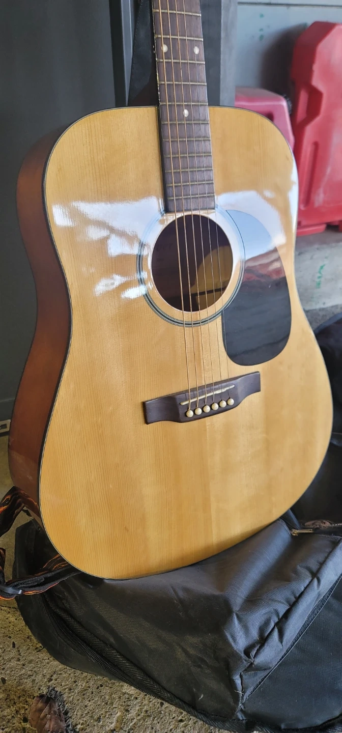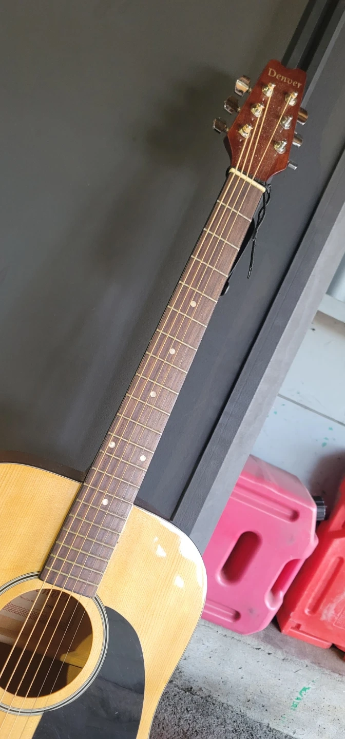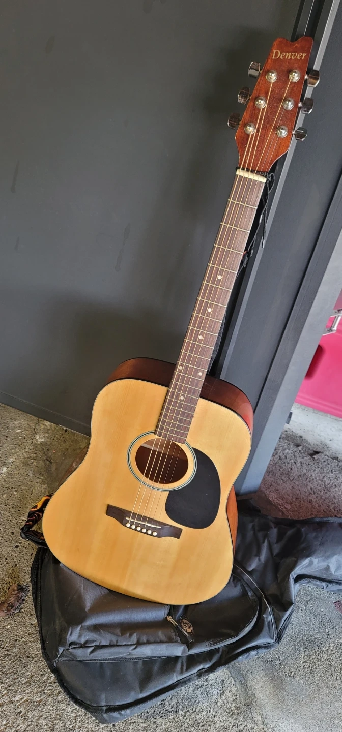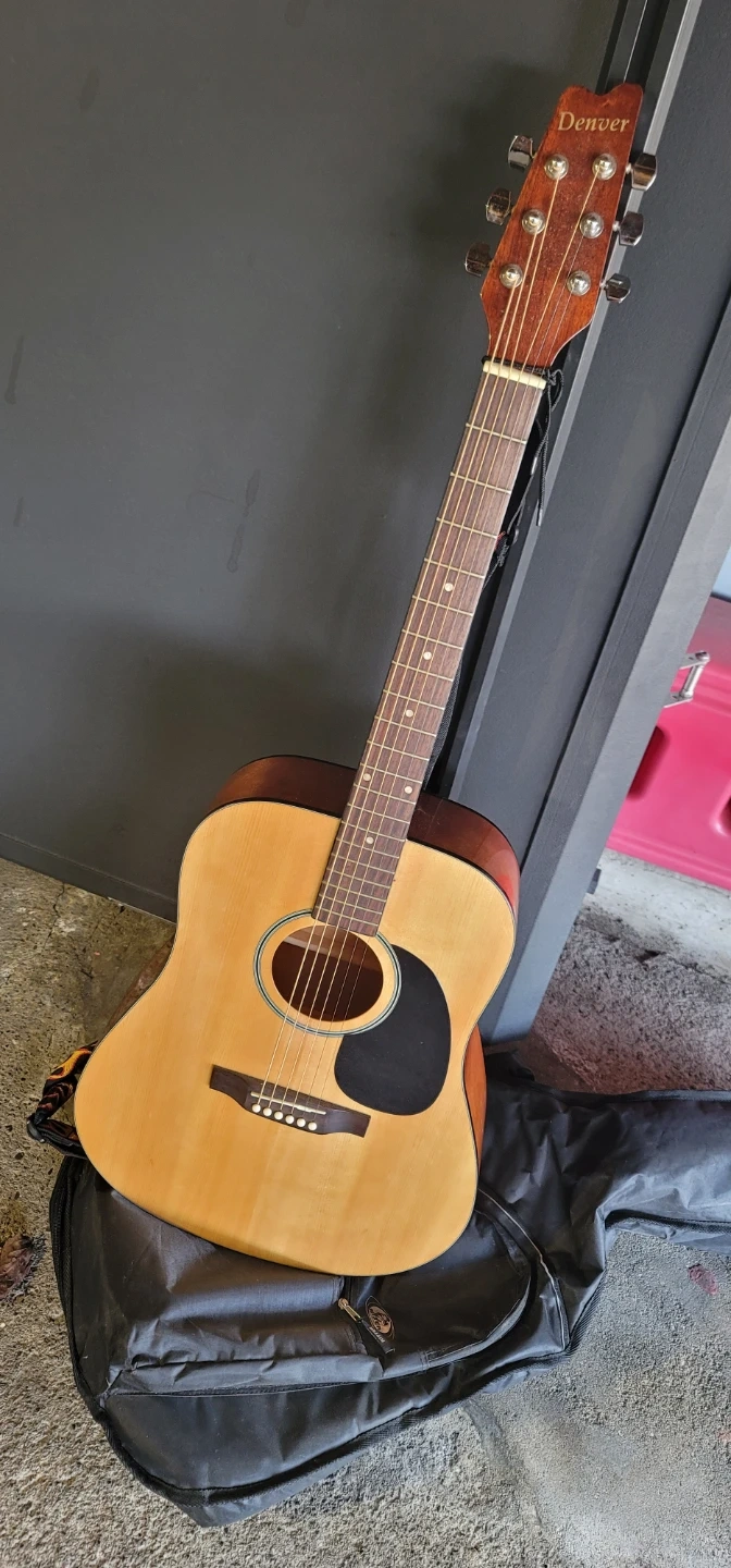Acoustic guitar from Denver with a natural wood finish. Comes with a black gig bag for easy transport. This guitar's ready for strumming!