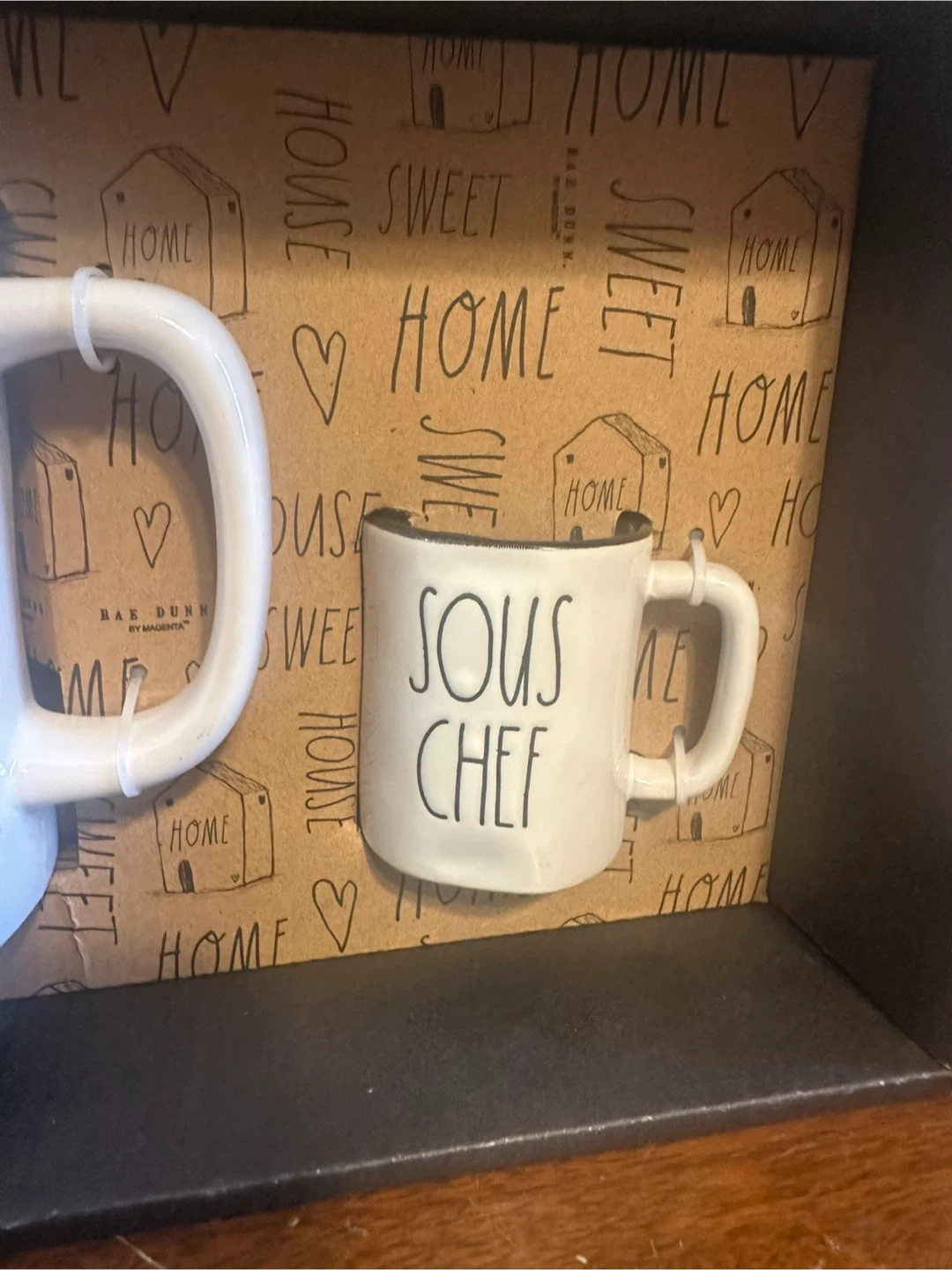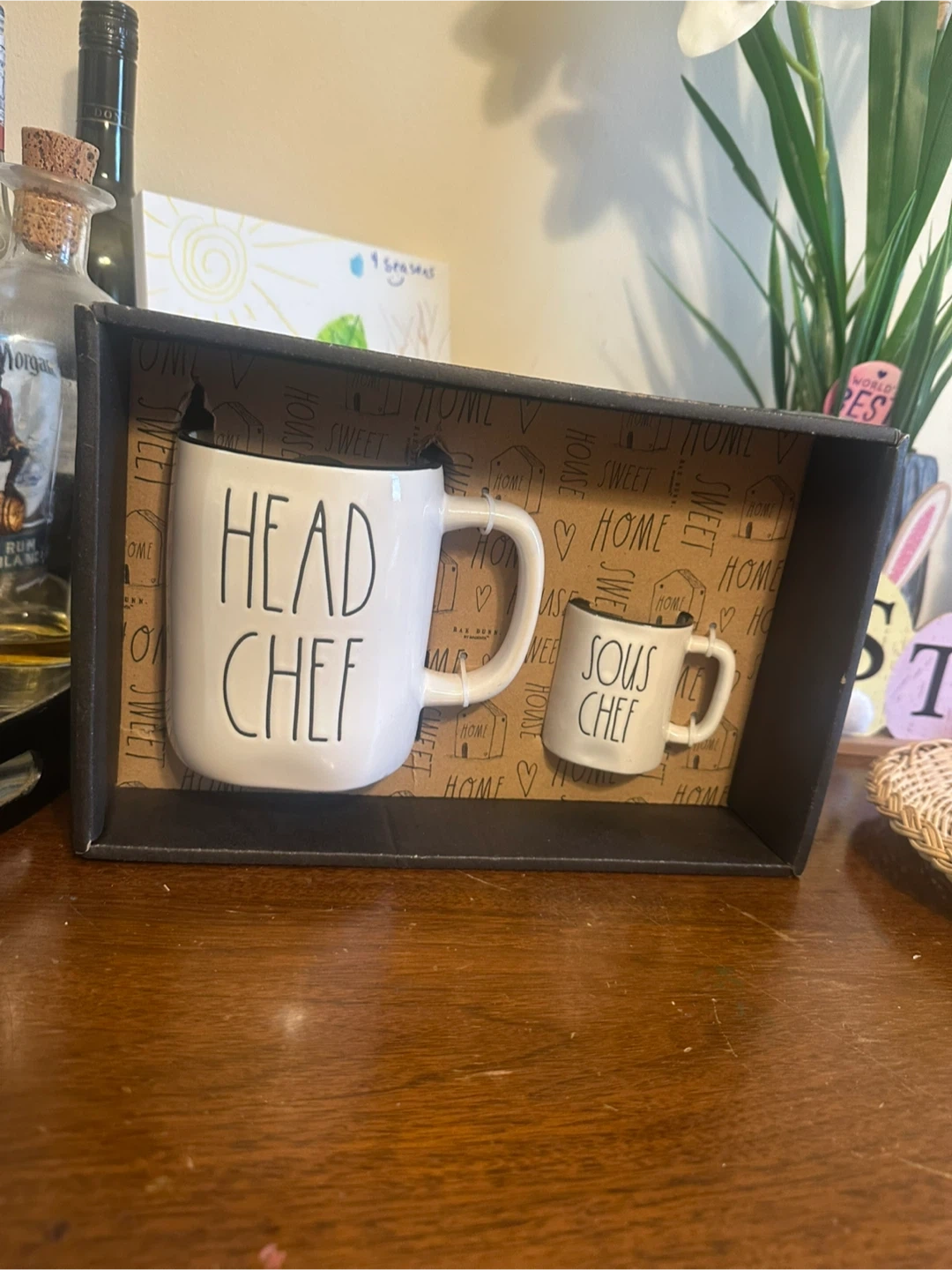 Two Rae Dunn ceramic mugs, one labelled "Head Chef" and the other "Sous Chef". Comes in original box packaging with "Sweet Home" design. These mugs are perfect for anyone who loves to cook or for a kitchen enthusiast!
