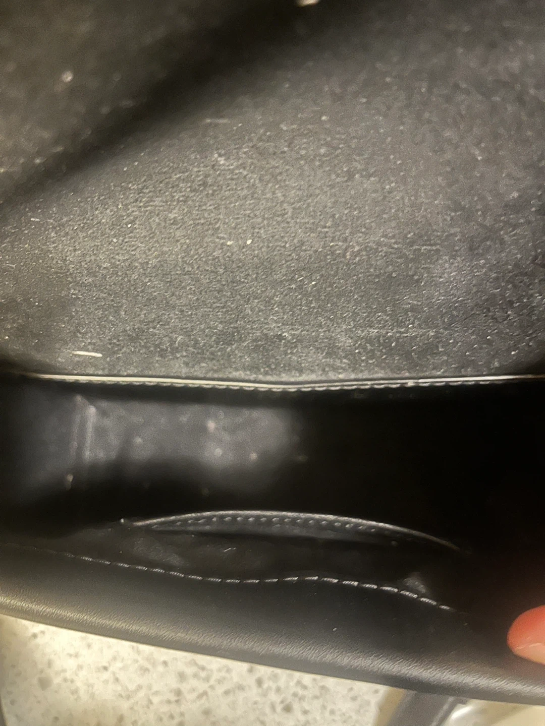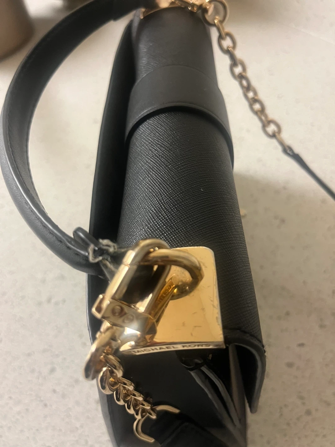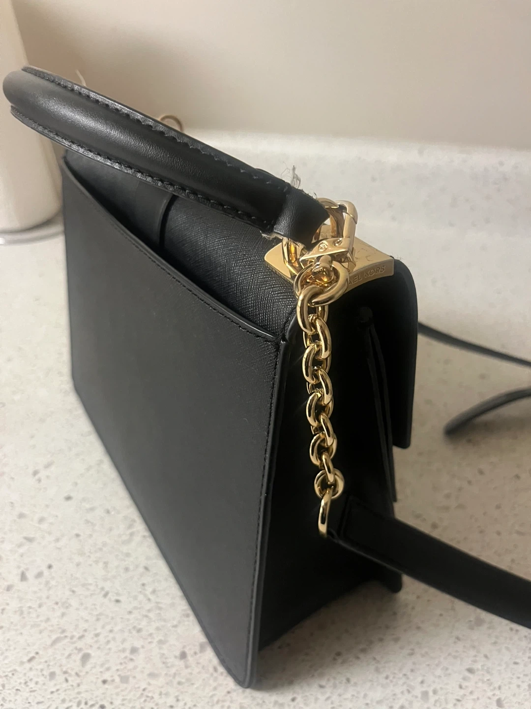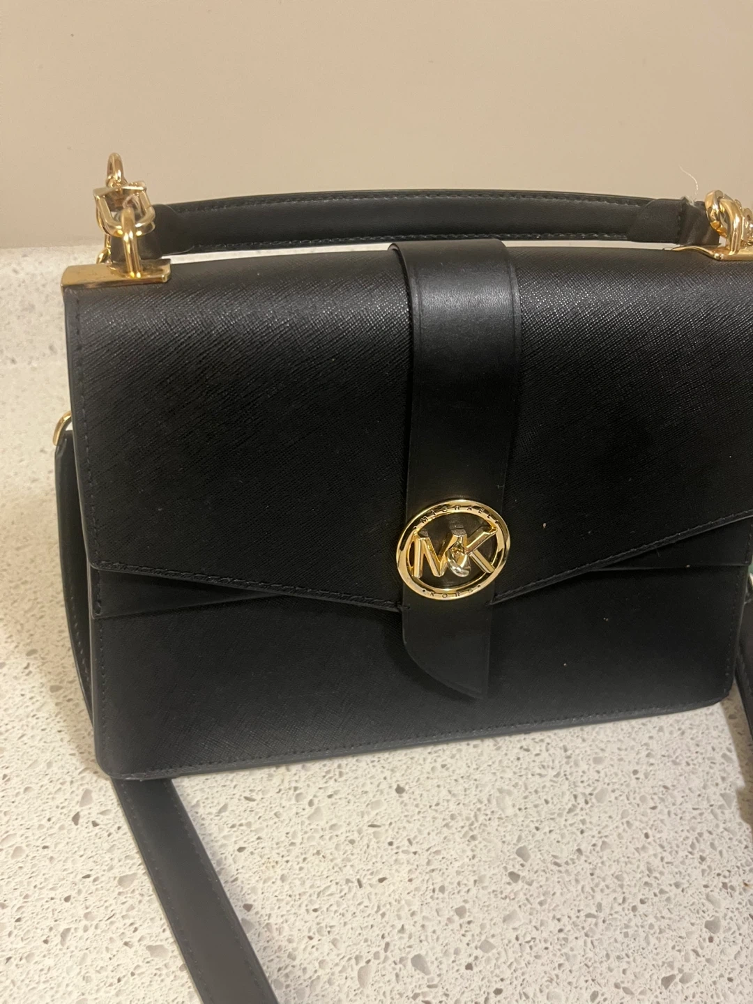 This is a black Michael Kors handbag. It's made of leather and features gold hardware. It has a top handle and a detachable crossbody strap.