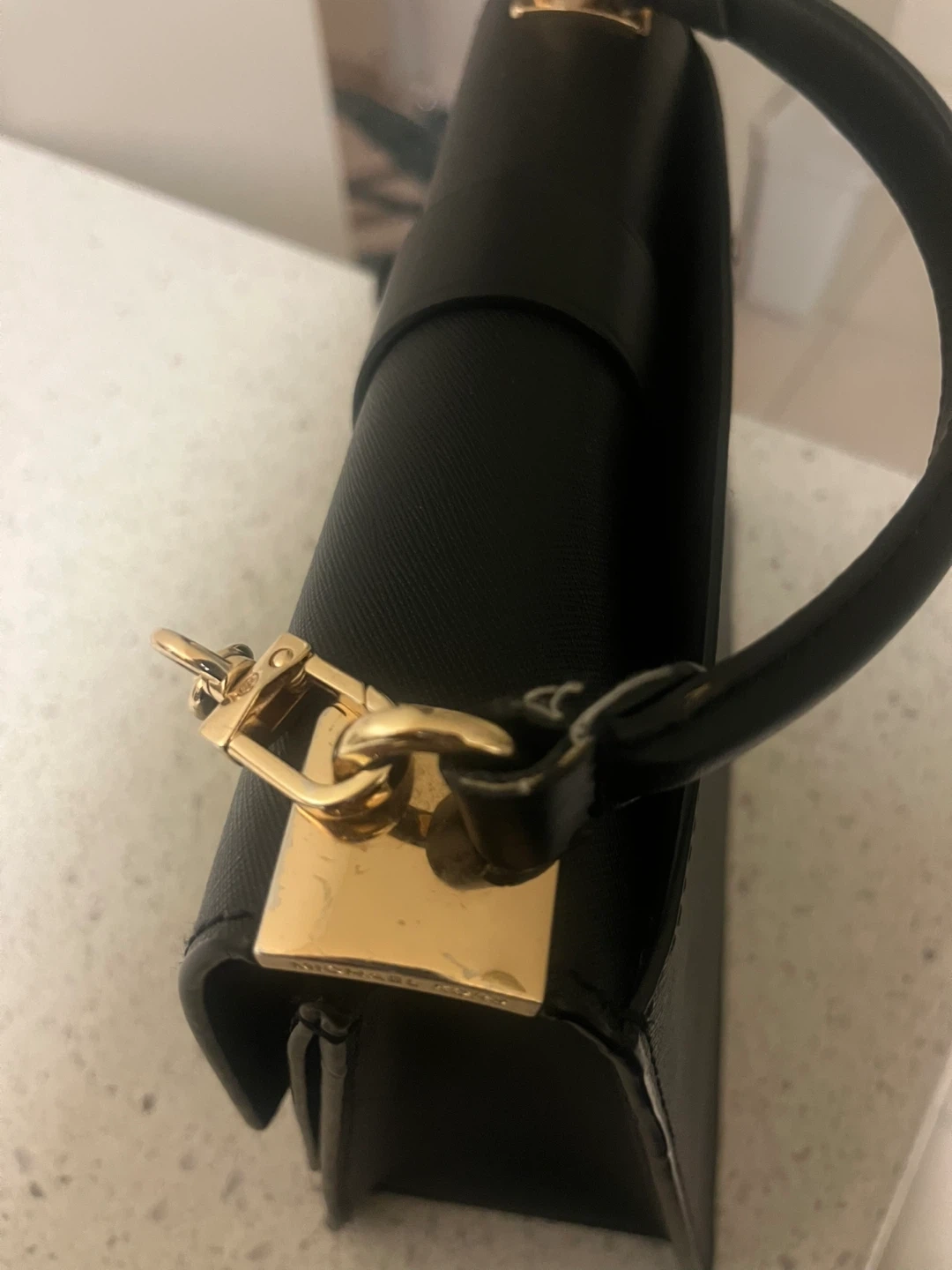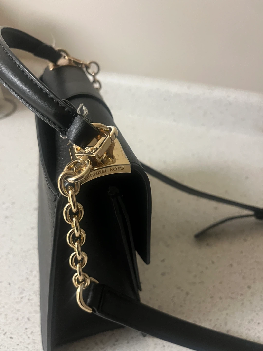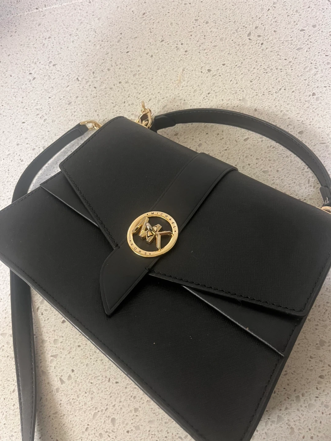 This is a black Michael Kors handbag. It's made of leather and features gold hardware. It has a top handle and a detachable crossbody strap.