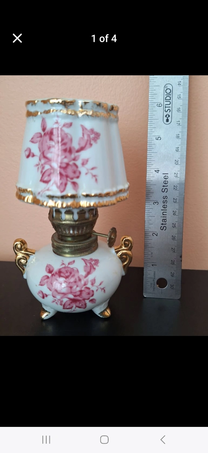 Adorable miniature oil lamp. Features a porcelain base with a pink rose pattern and gold accents. Brass-toned oil lamp mechanism. Small, collectible piece.