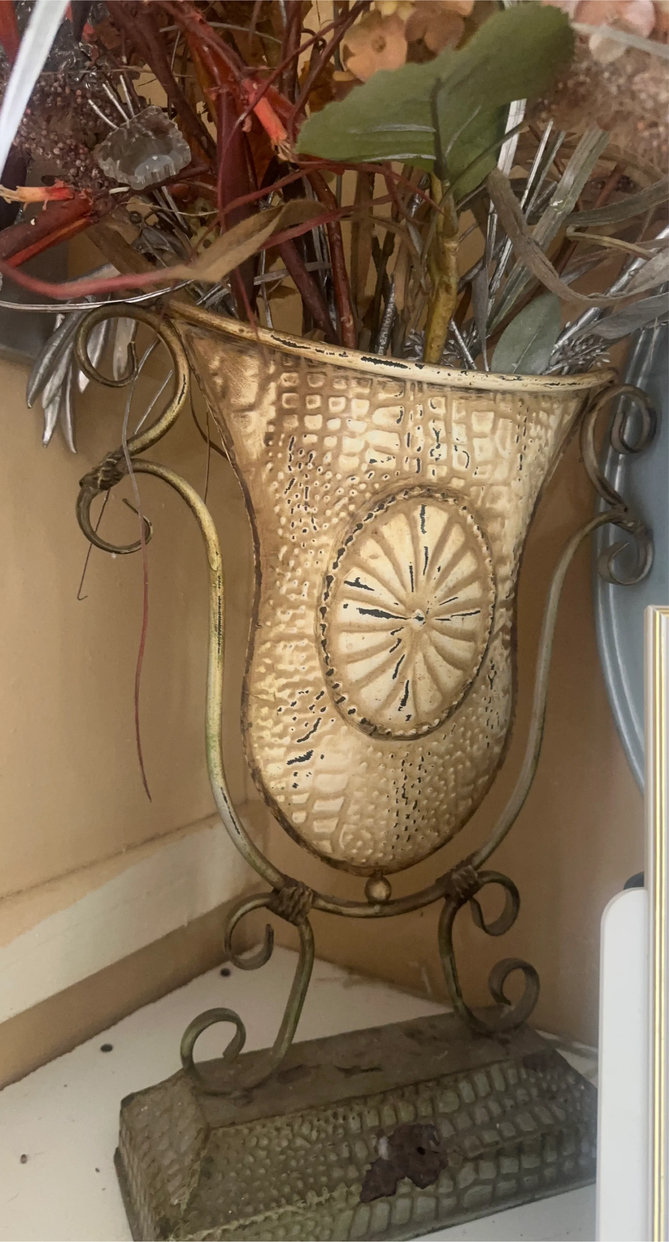 This decorative vase features an ornate metal stand. It has a textured finish with a medallion design. The metal construction offers durability.