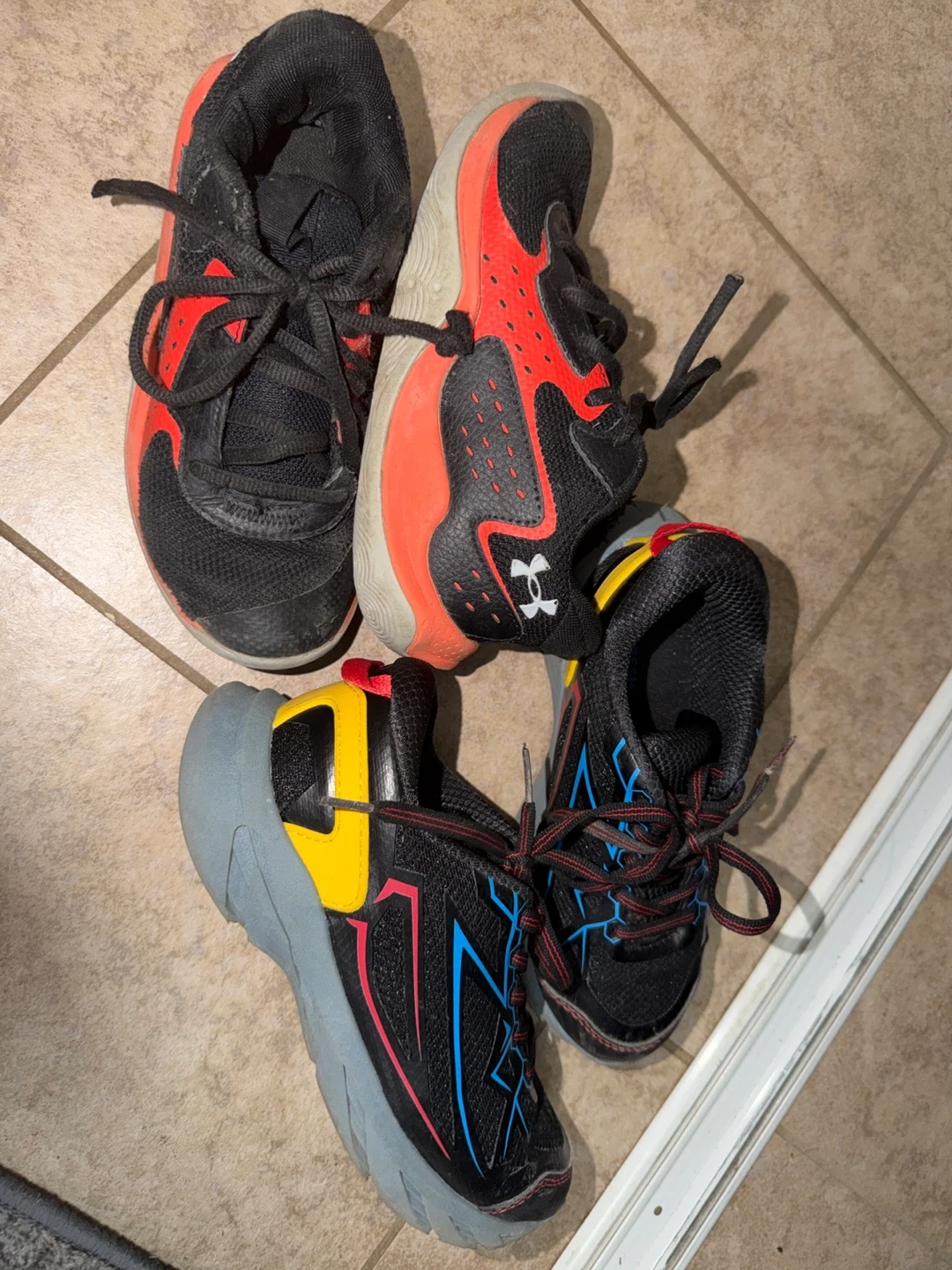 Two pairs of Under Armour kids' shoes. One pair is black and red, the other is black with blue and pink accents. Both pairs feature lace-up closures for a secure fit. They're built for active wear!