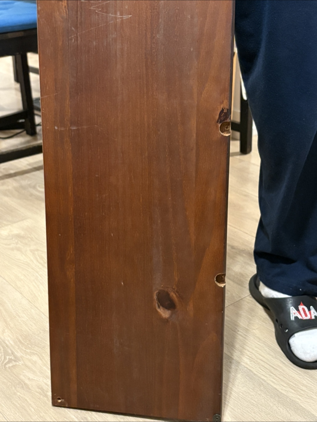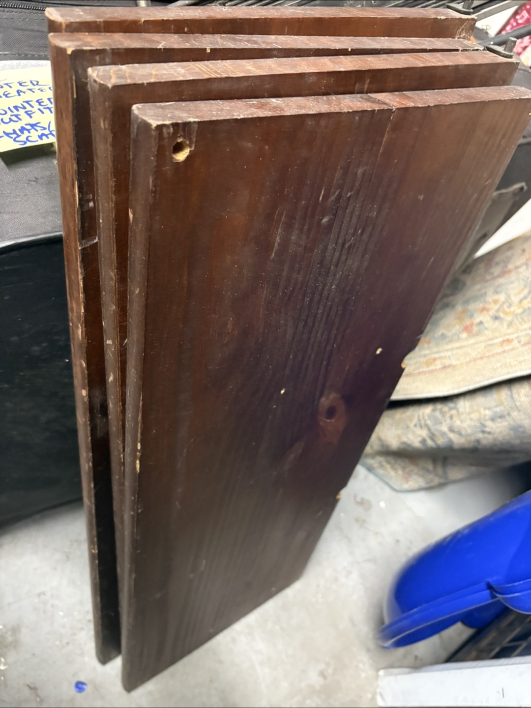 Four solid wooden shelves. They have a dark brown finish and are in used condition. No dents or big chips, perfect for someone who may want to sand them and paint them. No mounting brackets included.