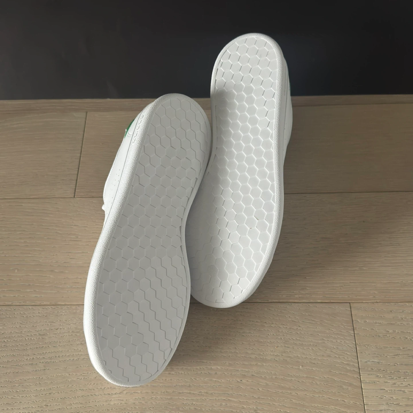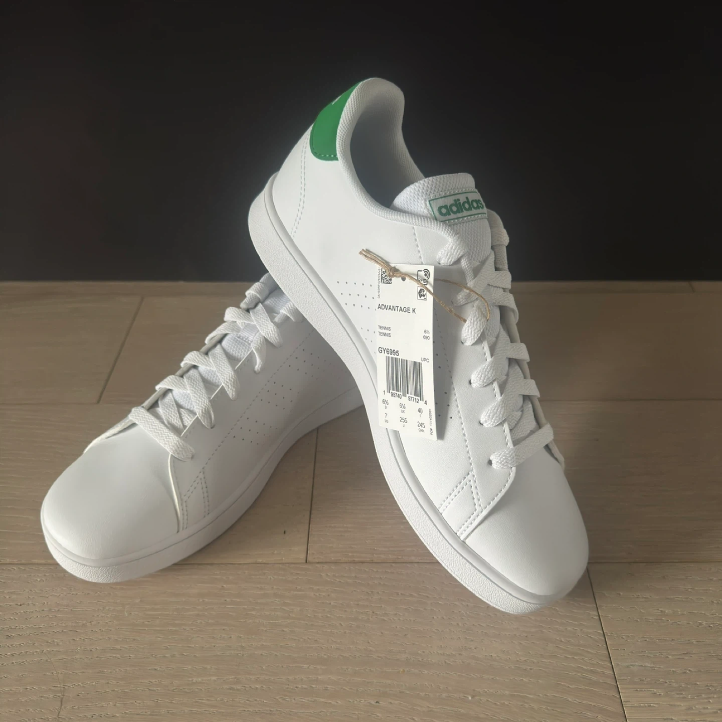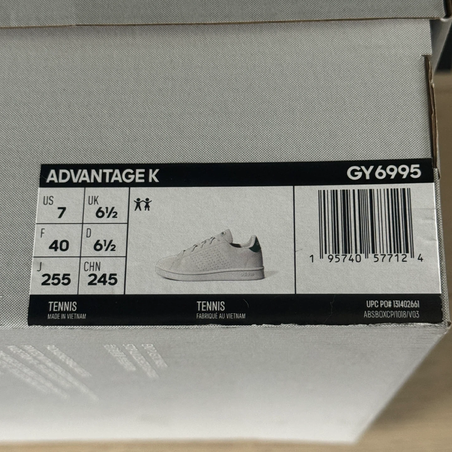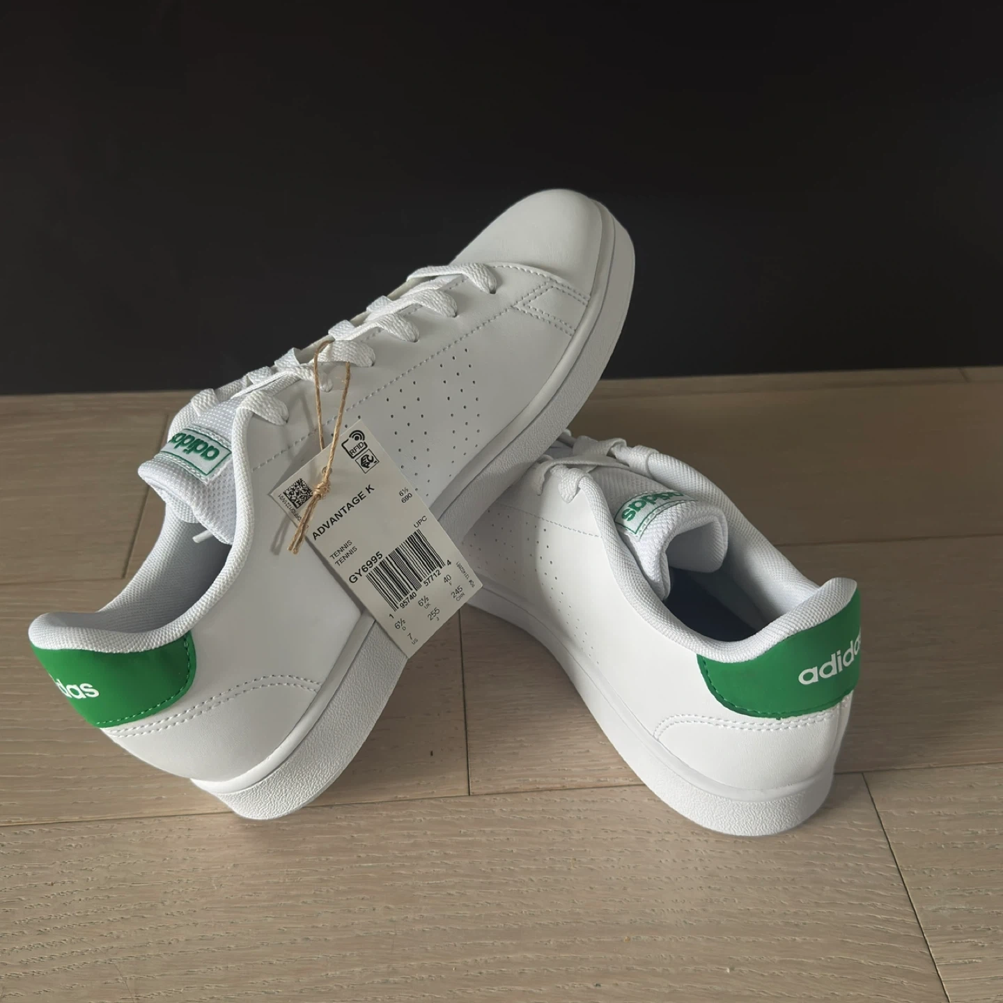 Selling a pair of Adidas Advantage K shoes in white and green, size US 7 youth. These are in excellent condition and ready for a new home!