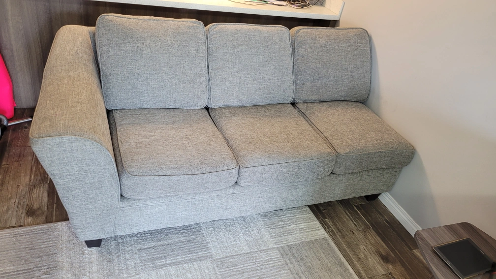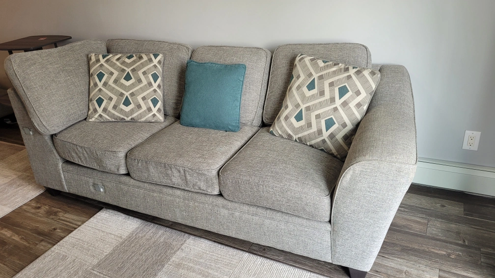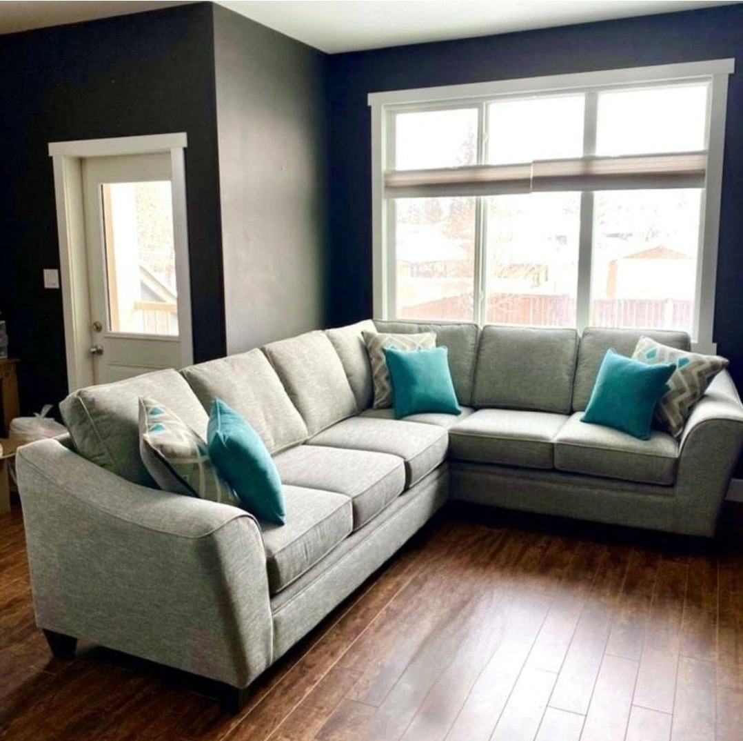 Large sectional sofa with grey fabric and wooden legs. Includes 6 throw pillows.