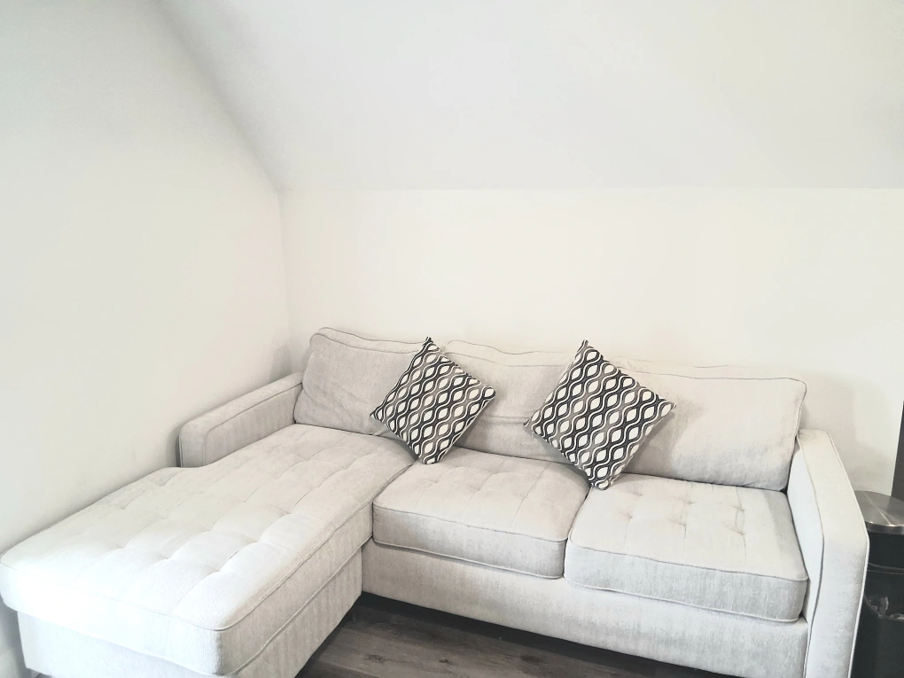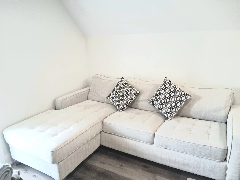 A lovely, neutral-toned sectional. Features an extended chaise lounge. Comes with two patterned pillows. A great place to read a book and relax after a long day.