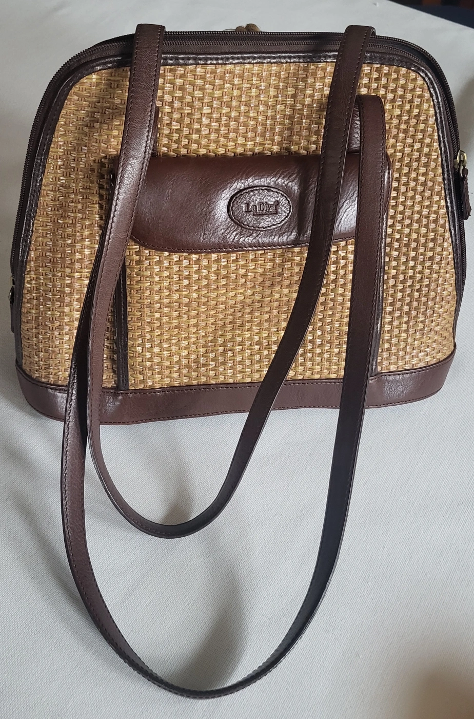 Woven handbag with brown leather accents. Has 2 zippered closure. multiple compartments, front and back pockets Hardly used, very good condition inside and out