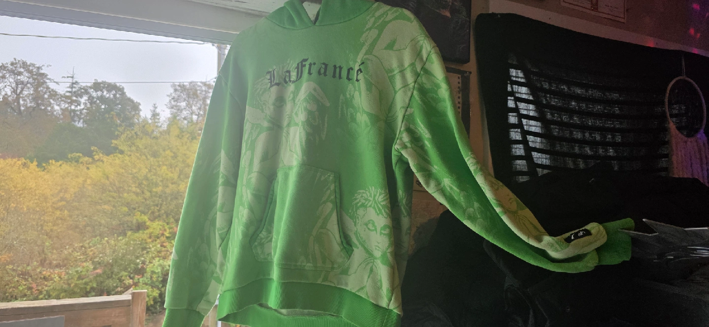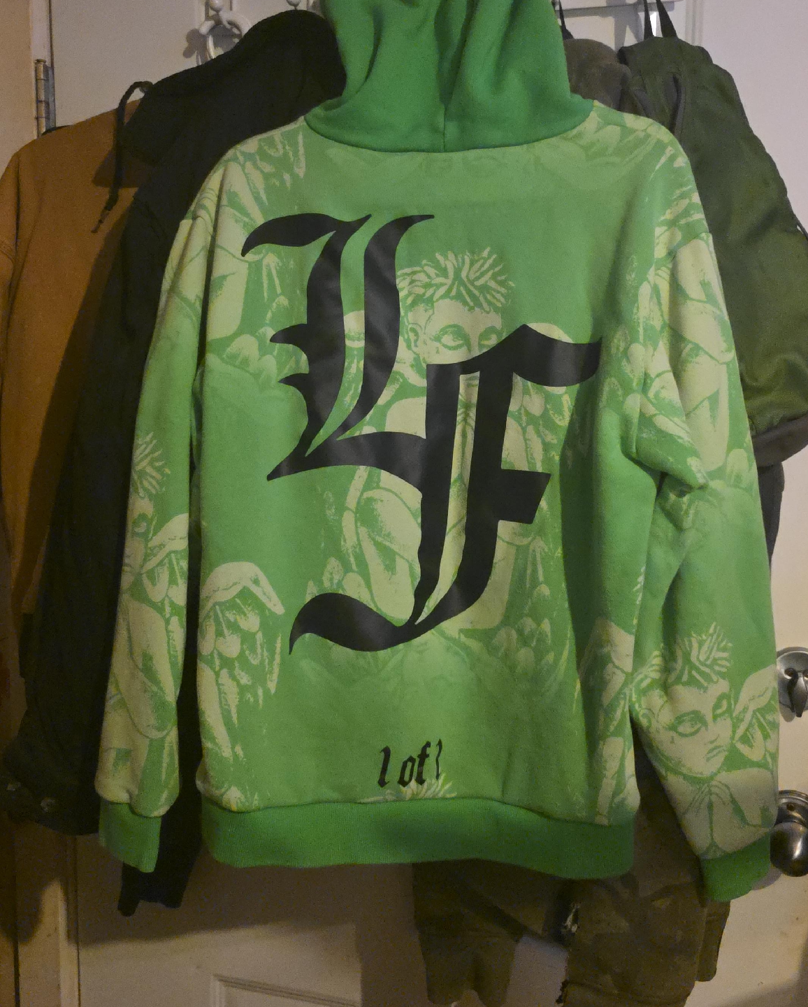 10Selling a La France hoodie in a vibrant green colour! It has a unique design on the back with the letters 'LF' and an all-over angel pattern. Machine washable in cool water. A cool piece to add to your wardrobe!