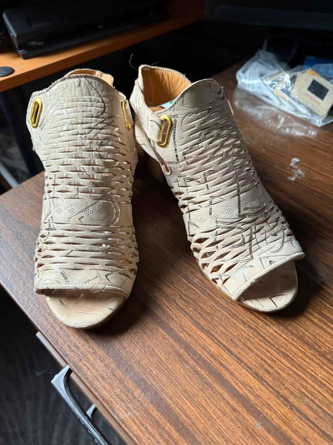 Women's beige “so soft “ leather sandals. Cut-out design. Block heels. Ankle strap closure. Size 8 Amazing comfort comes at no extra charge!
