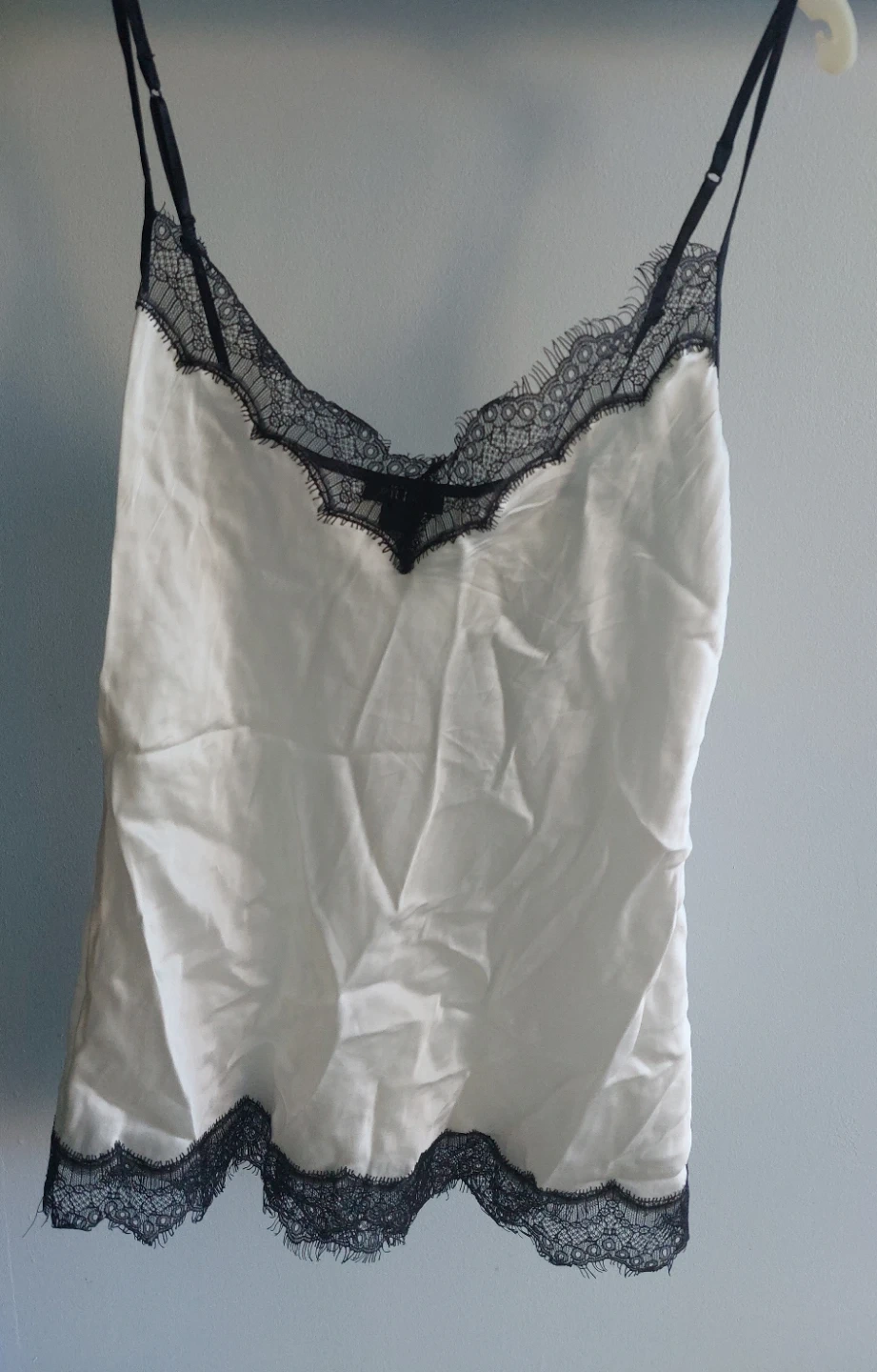 696This cami top is from La Senza's Prive line. It's a size M and made of 100% silk. The cami features delicate black lace trim, adding a touch of elegance. Worn once. Wrinkled due to storage. Can meet on Bloor line from Ossington to Main Street and Yonge/University line downtown. Available late morning to early afternoon on the weekends and occasionally during the week. Pickup and trade available.