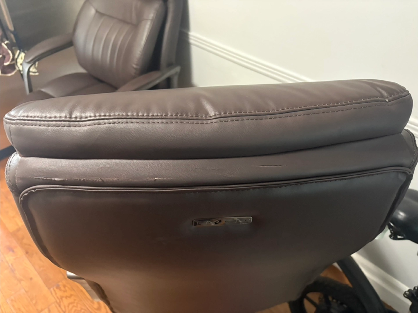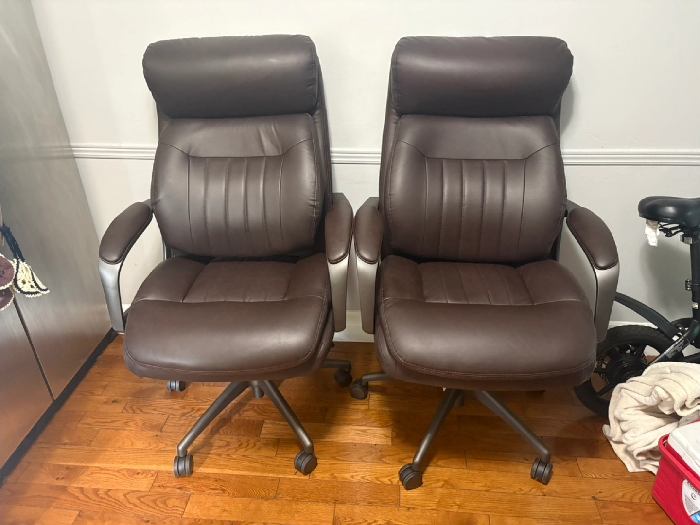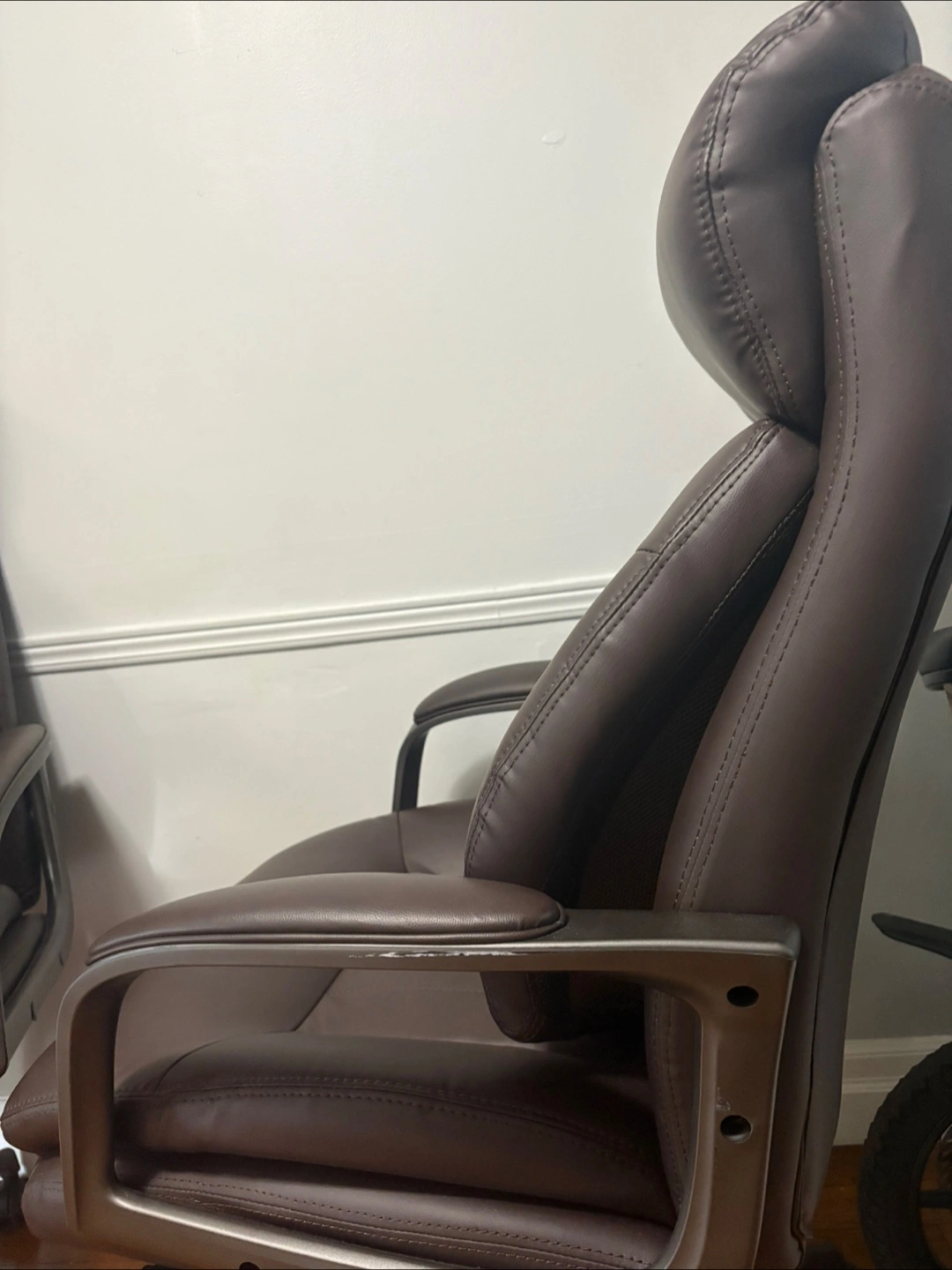 15Selling a La-Z-Boy executive office chair in brown. It has a high back for extra support and is super comfy for long workdays. There is a scratch on one the chairs from moving not from wear, as seen in the photos, but it's still a great chairs