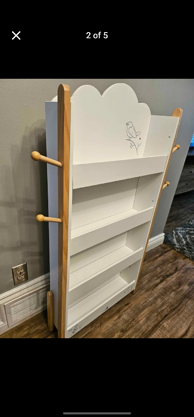 68This is a labebe bookshelf for kids. It's a white, 4-shelf wood bookcase, perfect for a baby girl or boy. It's a large children's bookshelf and can be used for books or toys. Dimensions are approximately 115cm (45.2") tall, 75cm (29.5") wide, and 15cm (5.9") deep