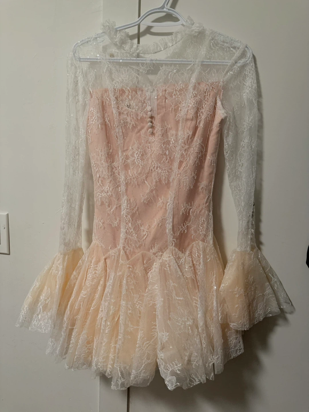 82Selling a lovely lace mini dress! It features a delicate white lace overlay with a subtle pink underlay. Perfect for a special occasion or a night out
