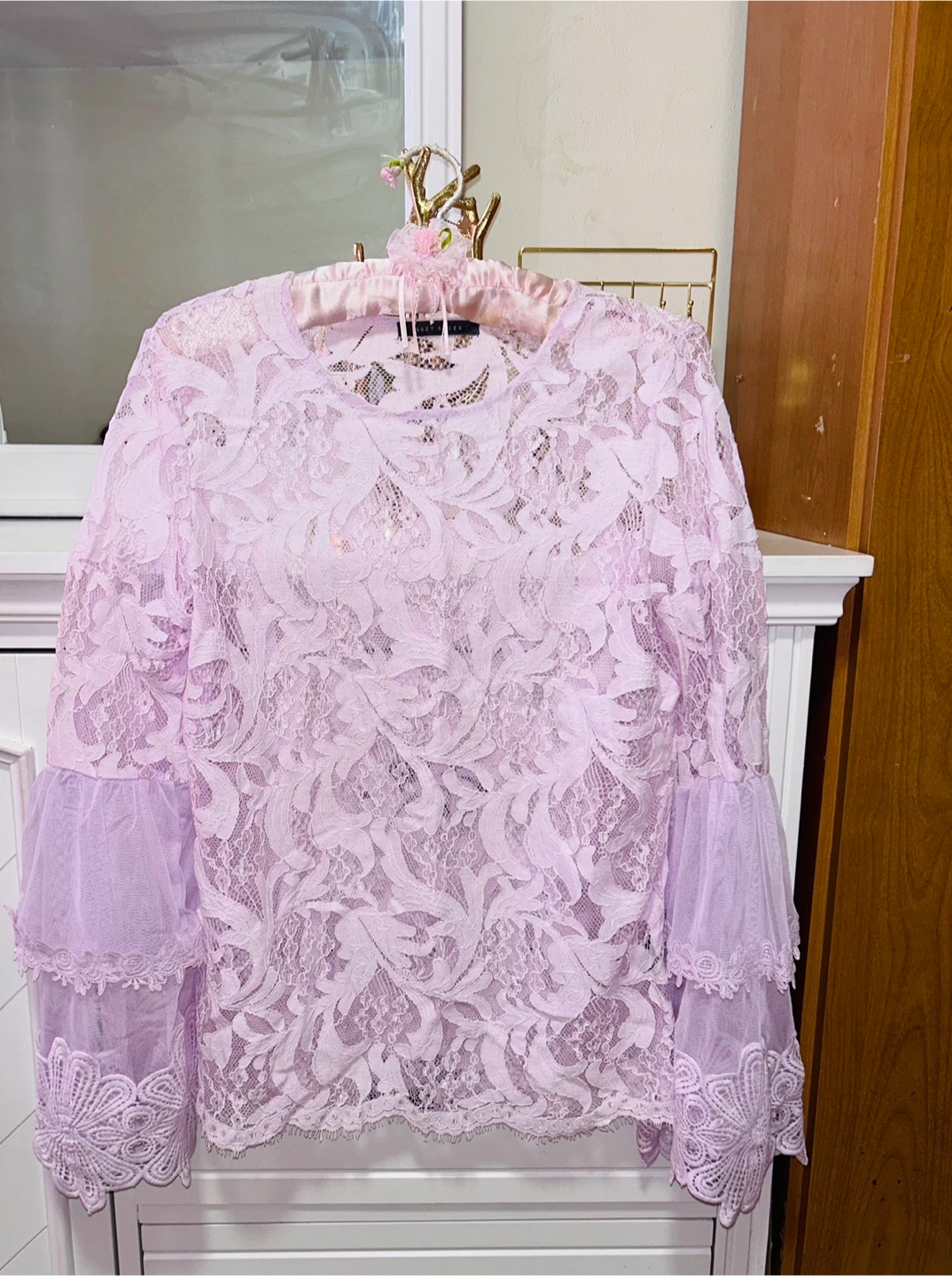 A beautiful long-sleeved lace top in a lovely shade of purple. Perfect for dressing up or down!