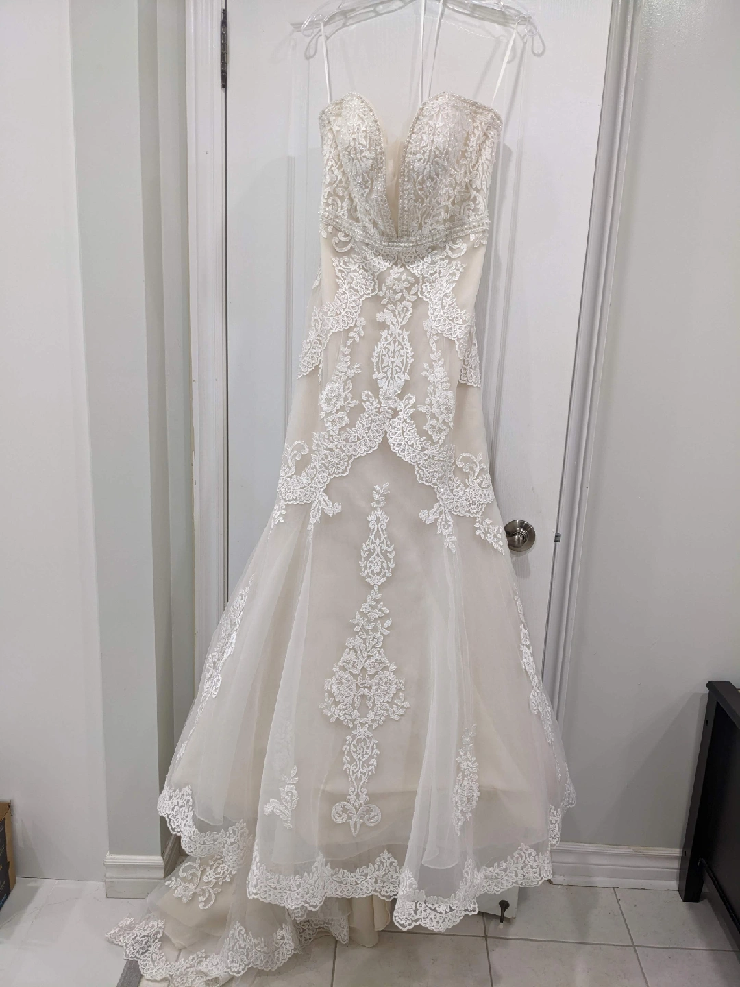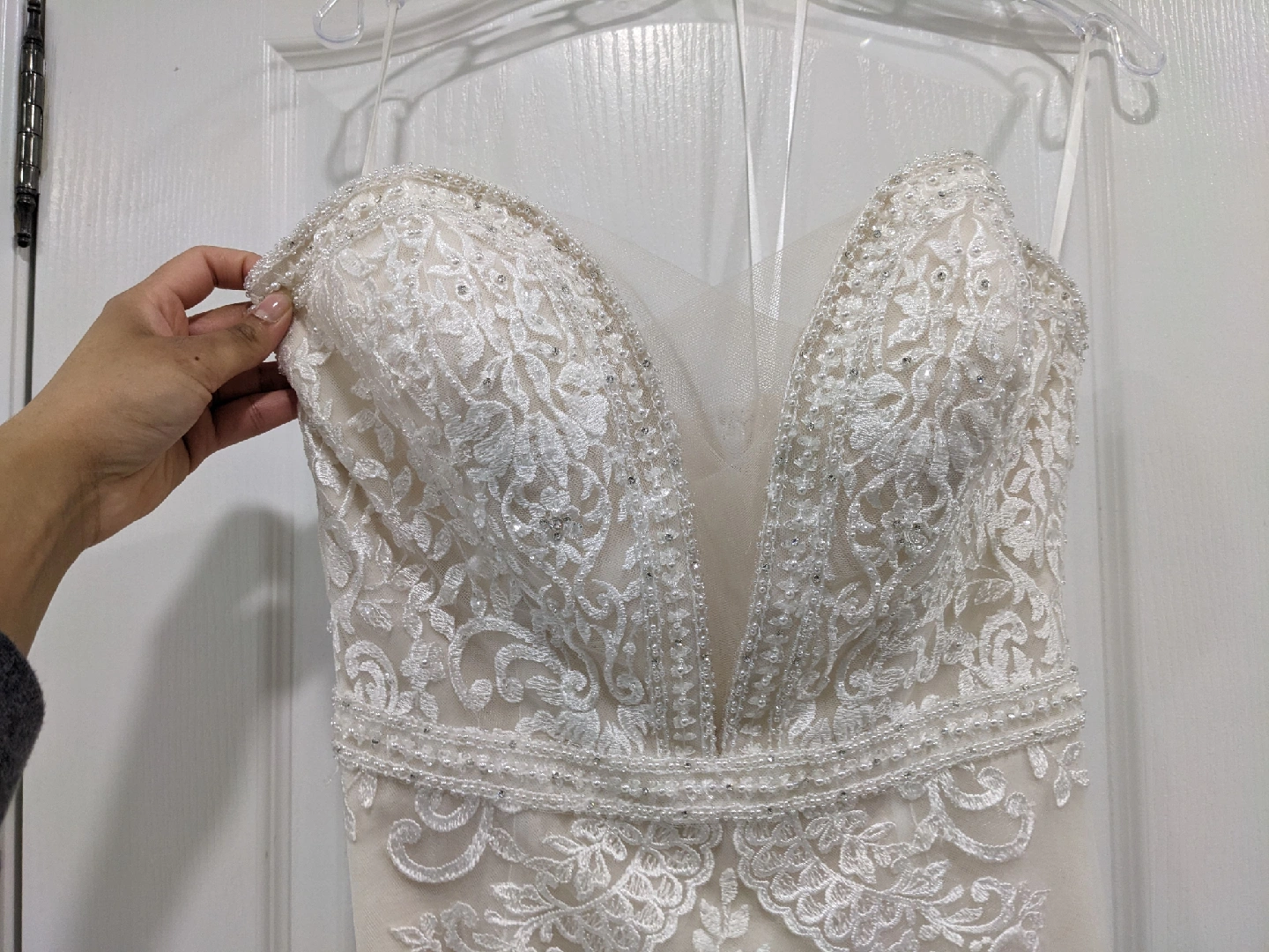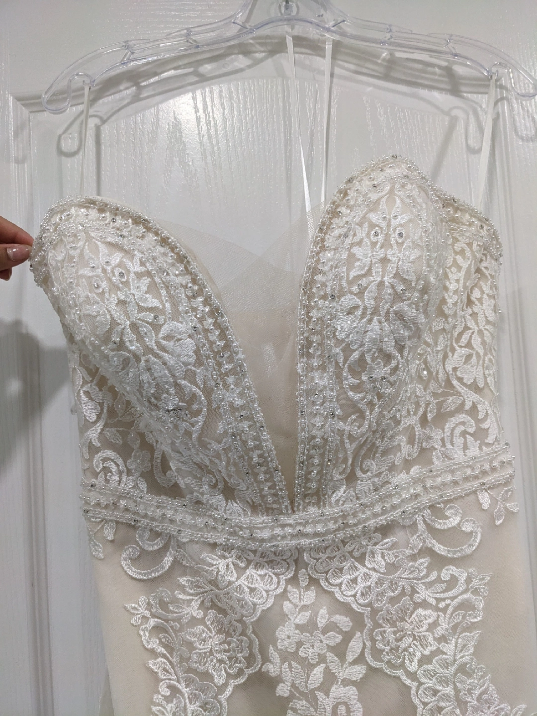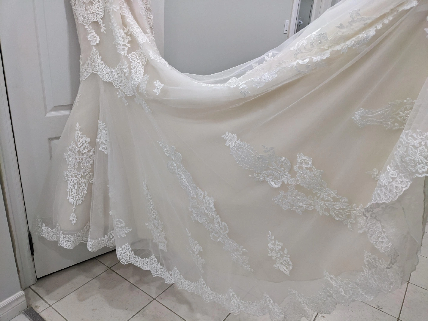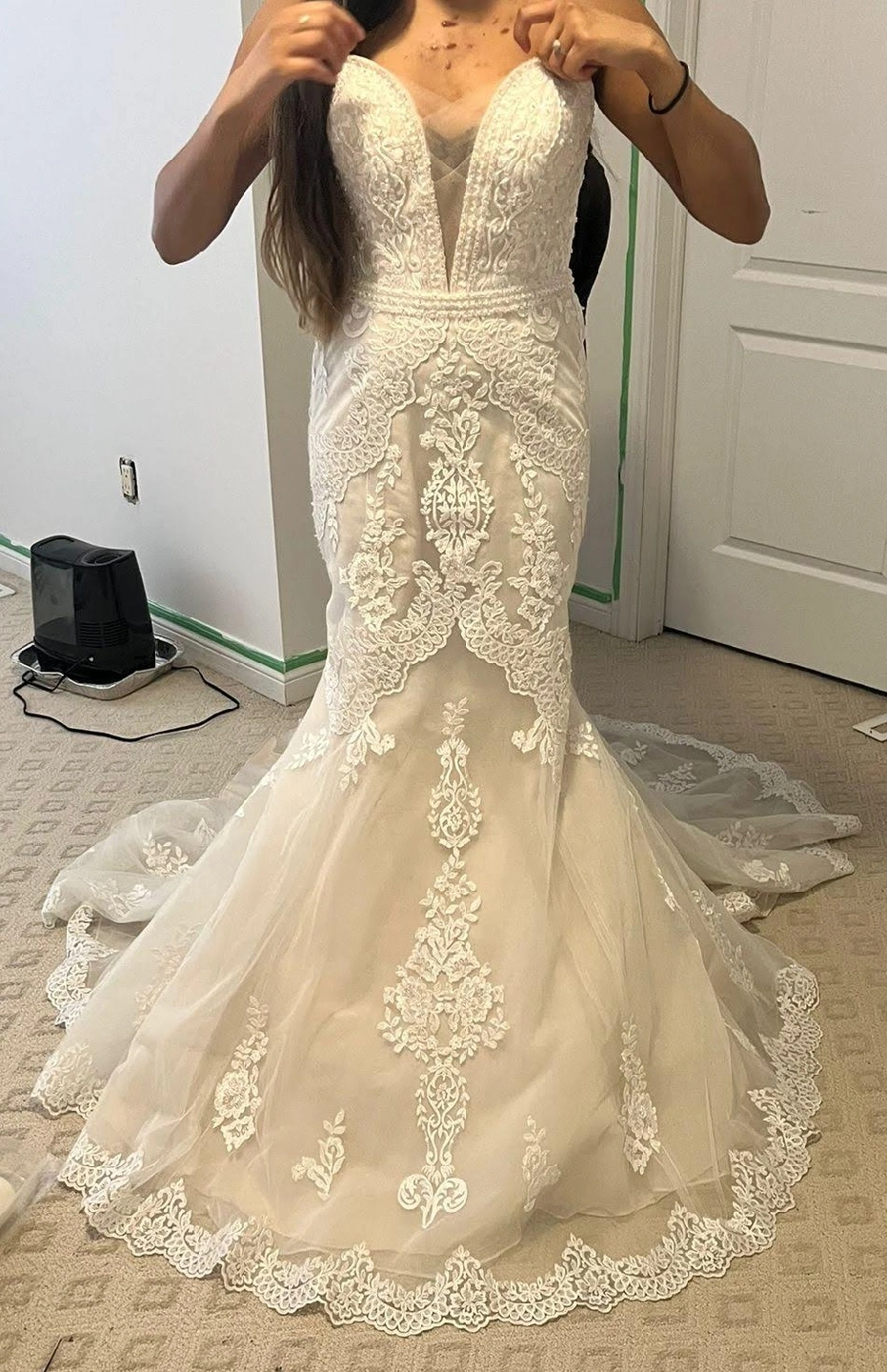 10Beautiful lace wedding dress, perfect for your special day! It features delicate lace detailing and a flattering silhouette. It's in perfect condition. Never worn (only tried on), never altered. Made in Barcelona. Swarovski Crystals. Very comfortable.