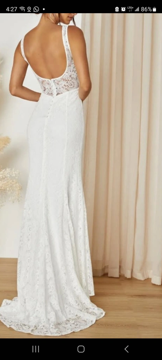 31Beautiful lace wedding dress in a sleeveless style. It's in great condition and ready for its next special occasion! The lace detailing is lovely and adds a touch of elegance. Perfect for a wedding or any formal event