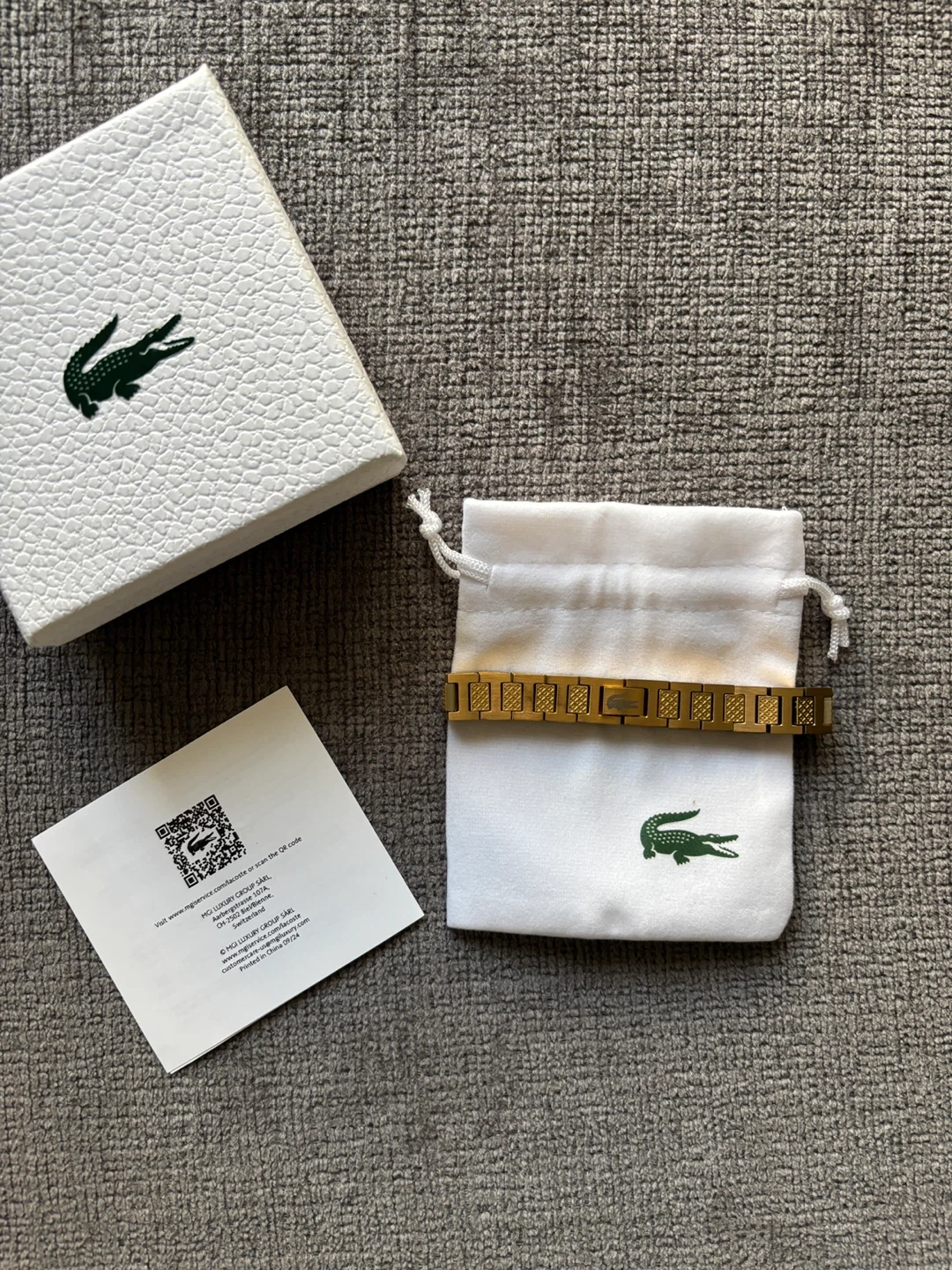 18Selling a Lacoste bracelet in gold! It comes with the original box and a dust bag for safekeeping. It's a stylish accessory to add to your collection!