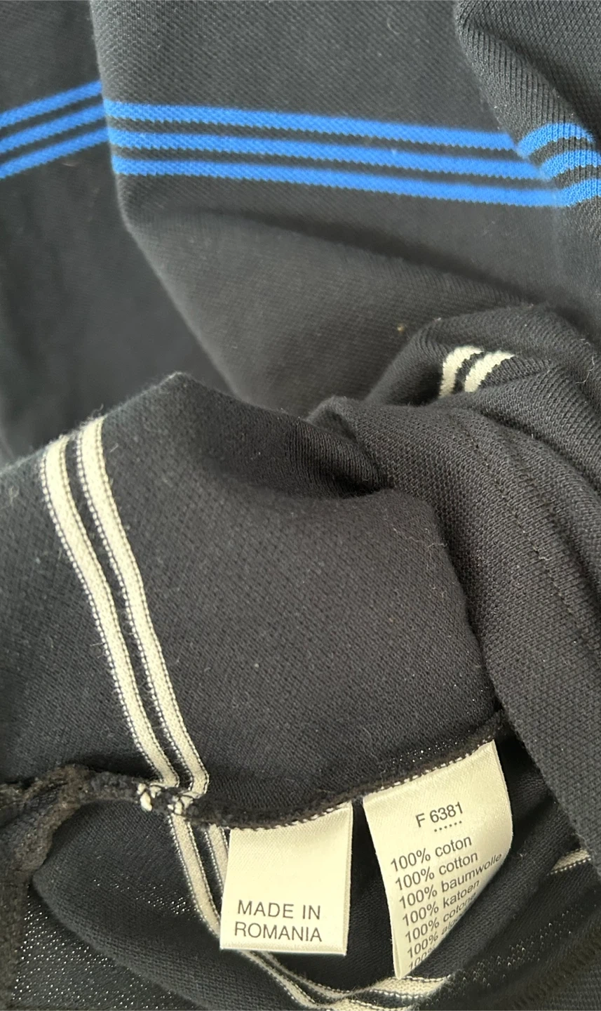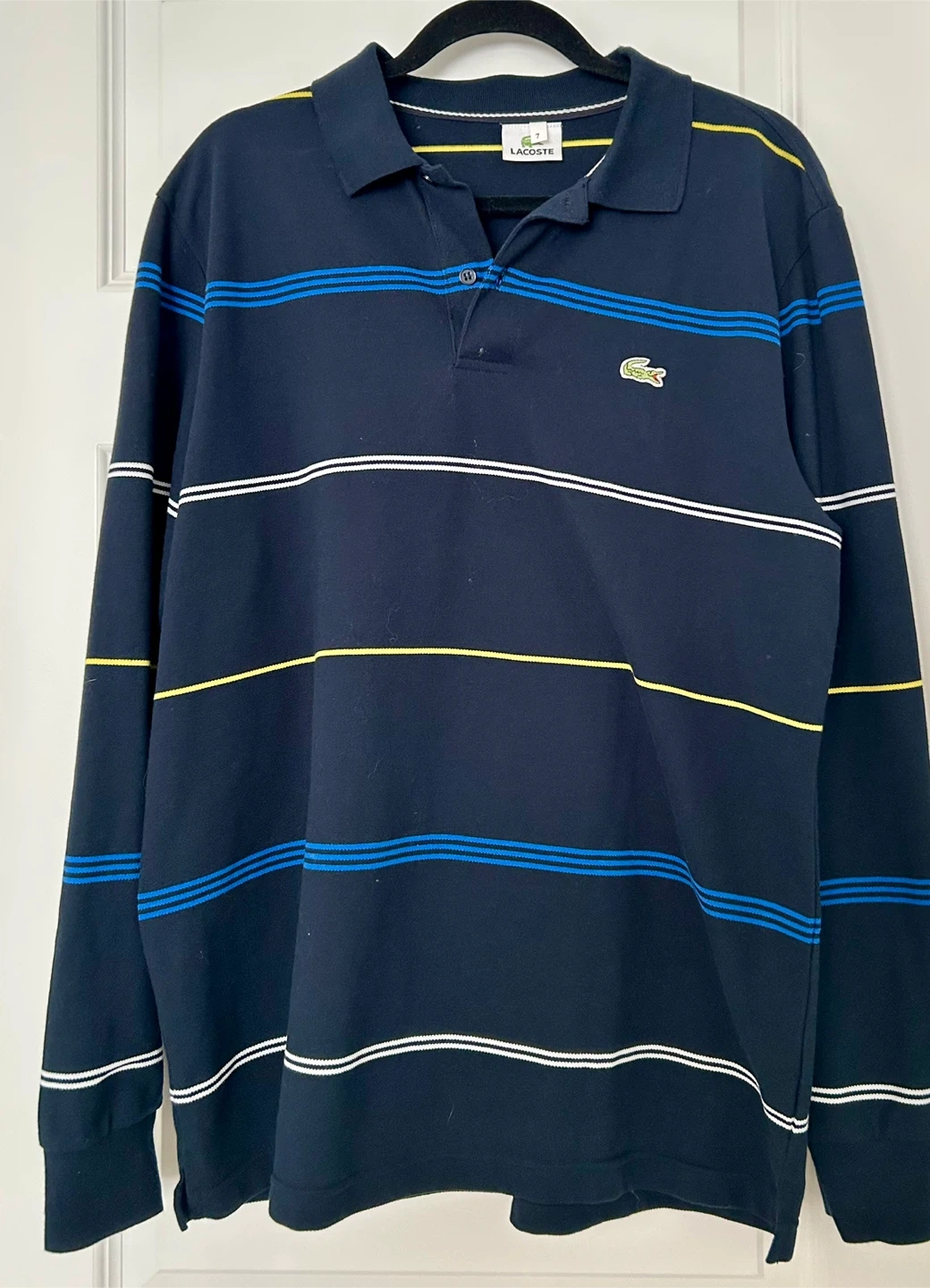 10Selling a Lacoste long sleeve polo shirt. It's a size 7 and made of 100% cotton. The shirt is navy blue with blue, yellow, and white stripes. Made in Romania!