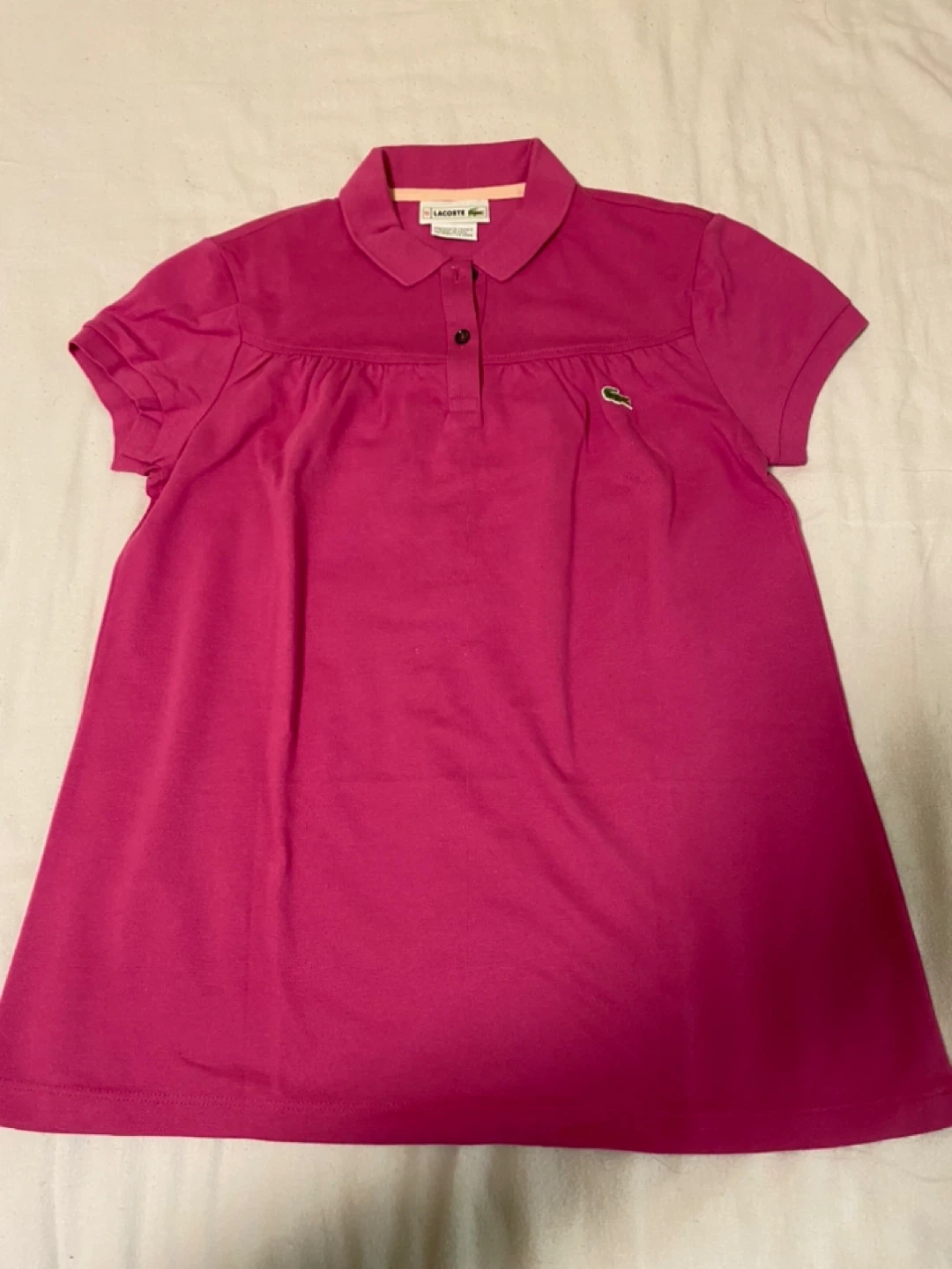 26Selling a cute frilled Lacoste polo t-shirts in a vibrant pink! It's a size 16Yr for girls and 100% cotton. New one without tag.