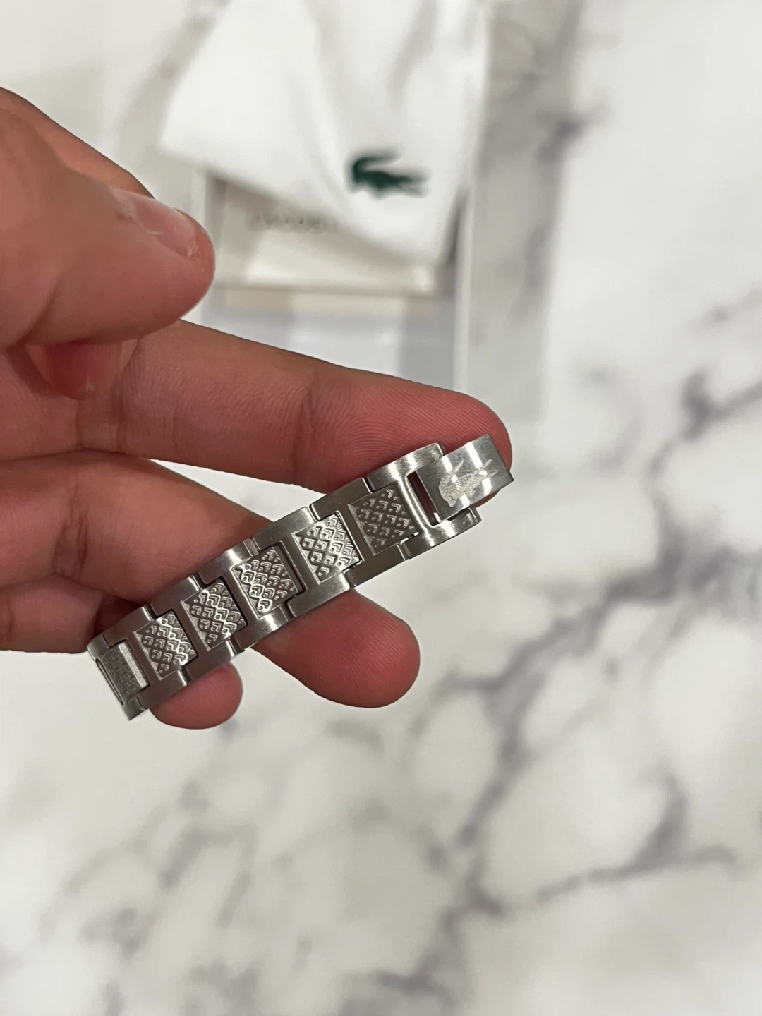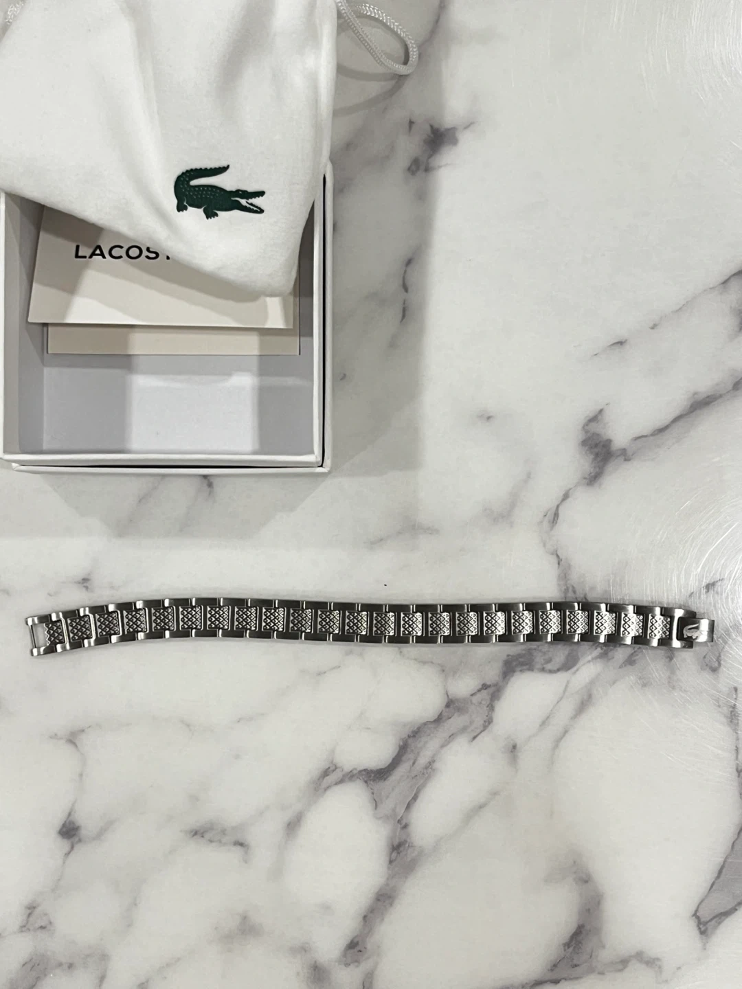 18Stylish Lacoste Men’s Bracelet Made from premium stainless steel, this Lacoste bracelet combines modern design with everyday comfort. The engraved pattern adds a bold, luxury touch that stands out without being flashy. It’s tarnish resistant, easy to clean, and built to last perfect for both casual wear and formal outfits.