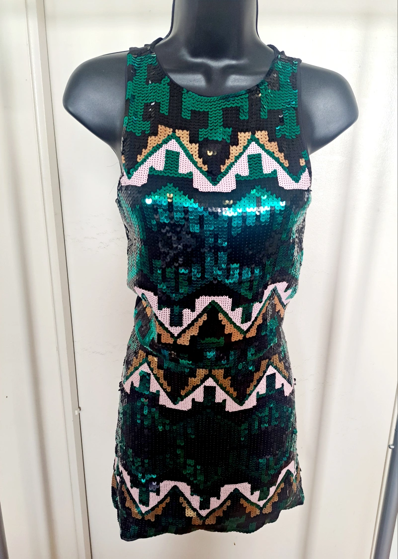 Ladies Sequin Geometric Skirt Set - New Size: Top (small) S-M / Bottom (10) S -M Amazing stretch Brand New Perfect for any special occasion Makes a striking statement Paid 65. Great deal, final, no further discounts.