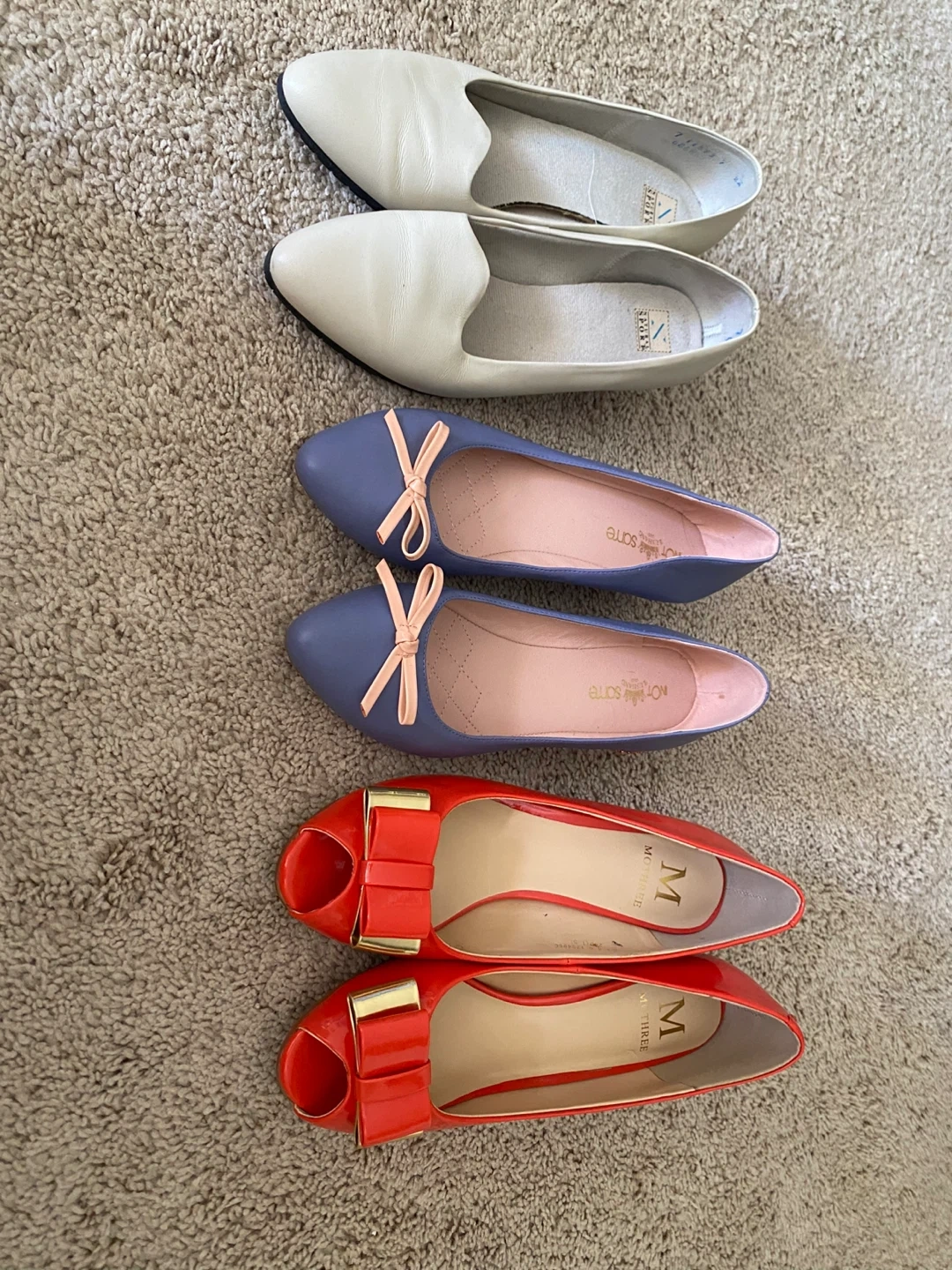 146Selling a bundle of ladies' flats, all in excellent used condition. Includes one pair each in cream, red, and blue. All size 7.