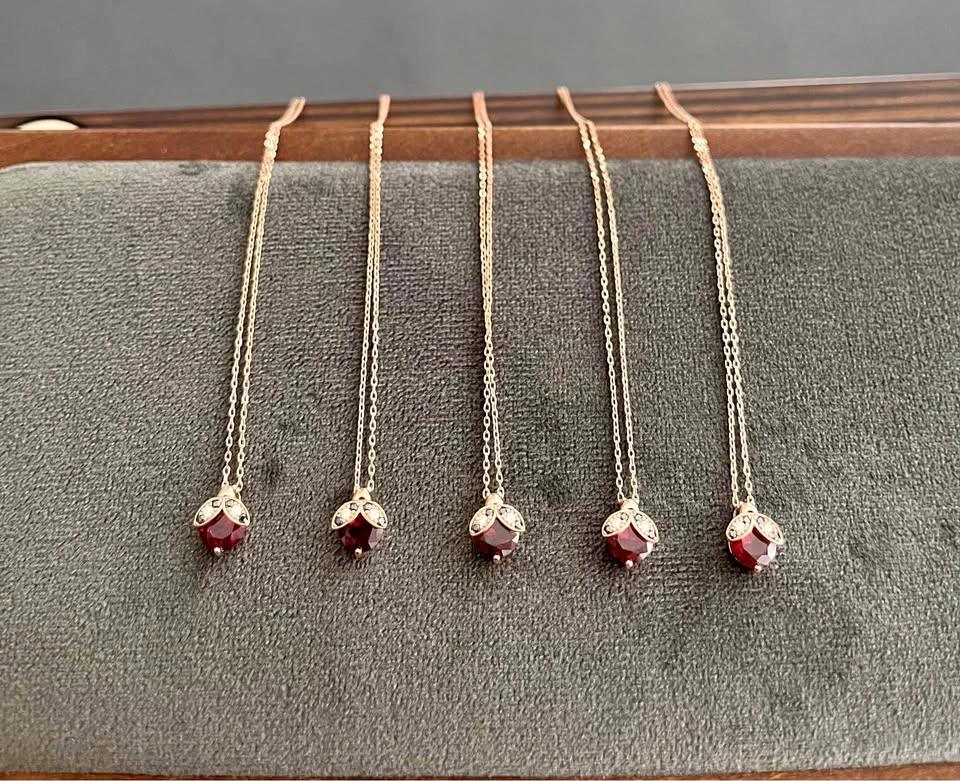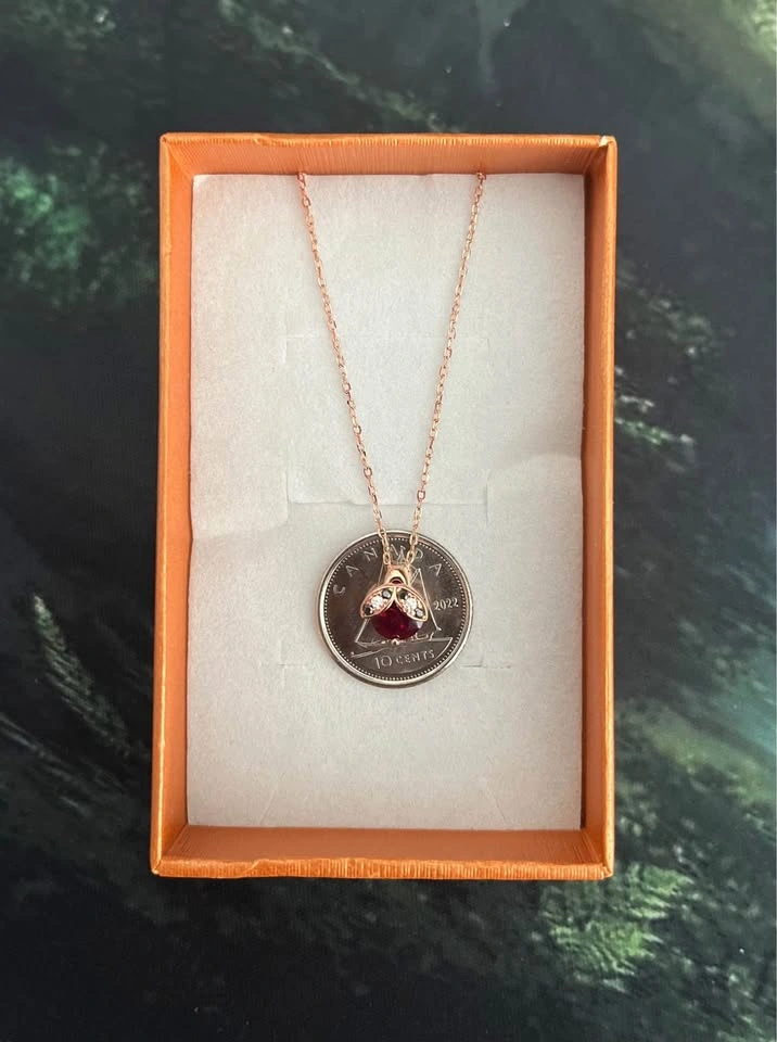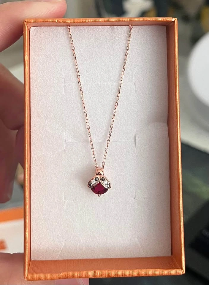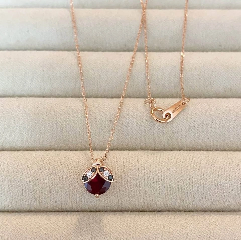 A beautiful piece of jewelry! * Setting: 18k Rose Gold Vermeil * Center stone: Lab-grown Ruby * Accent stones: White and Black Mossanite * Chain length: Adjustable 16-17 inches * Last 3 pieces available Pick up location: Lower Mount Royal