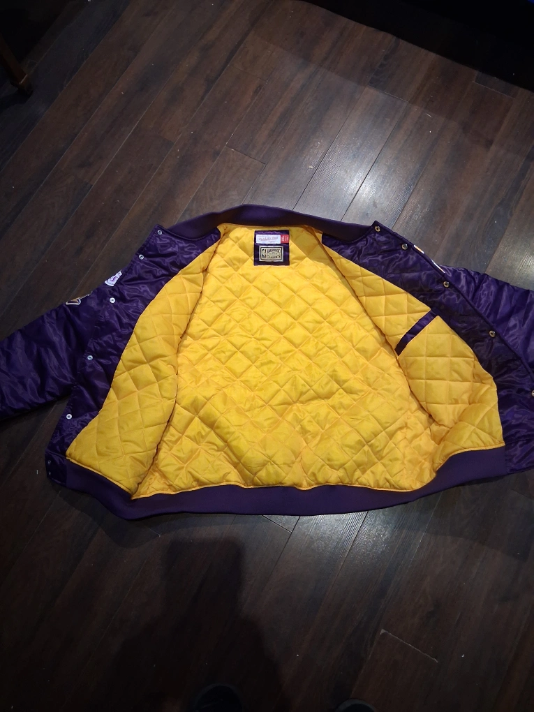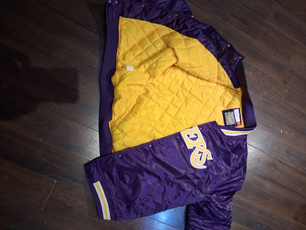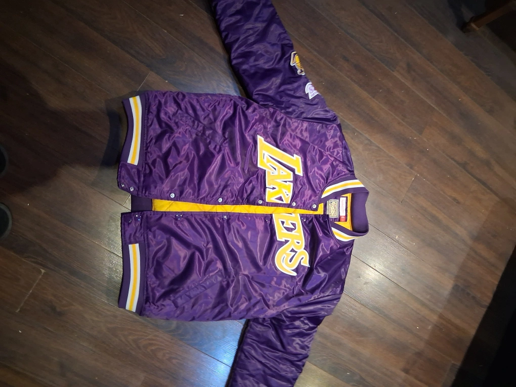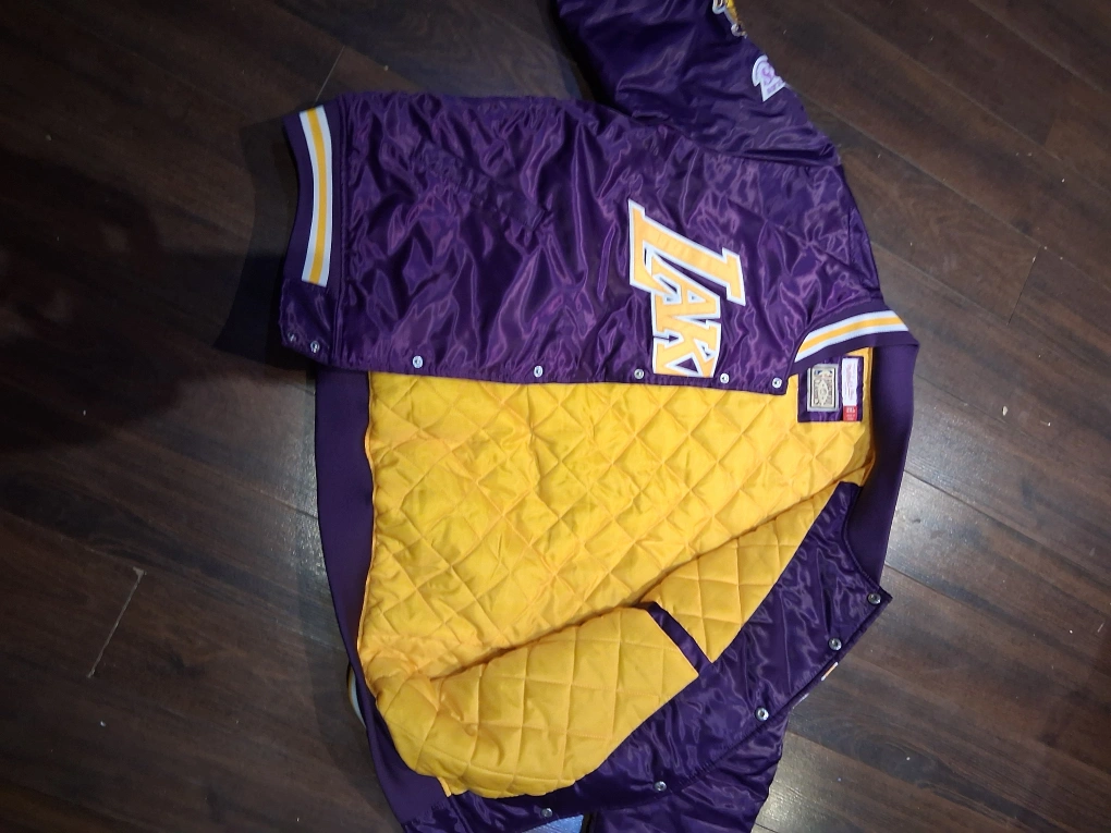 60Selling a Starter brand Lakers jacket. It's purple and gold with the Lakers logo on the front. Great for any Lakers fan!