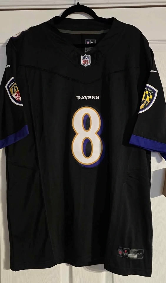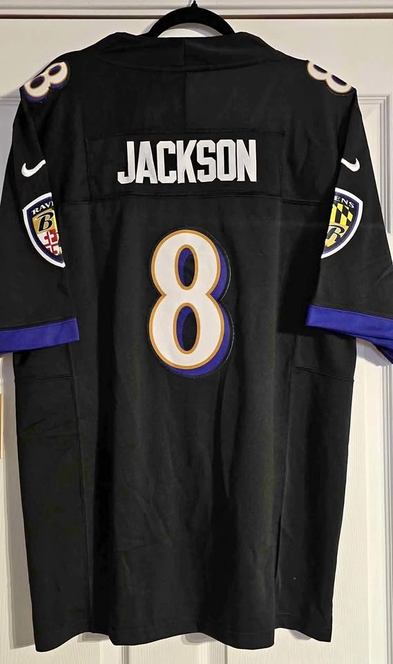 5#8 Lamar Jackson - Baltimore Ravens Jerseys avaialble: Black: L, XL Purple: L, XL Jerseys are stitched. Great quality. Loose fit.