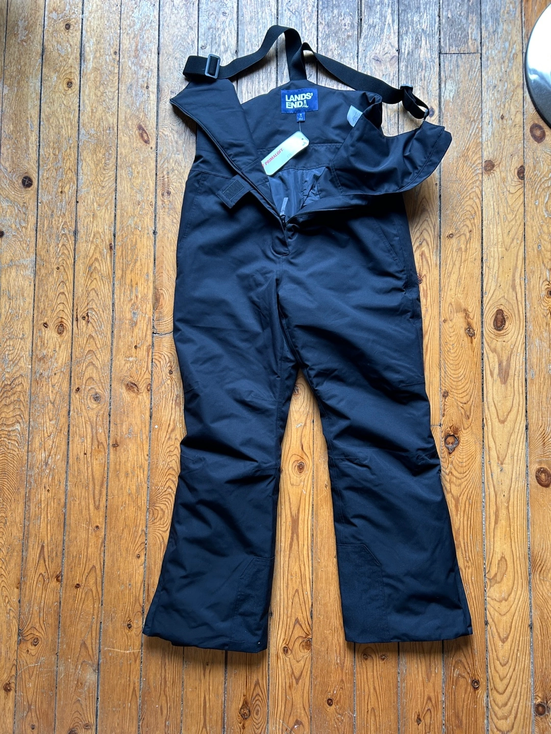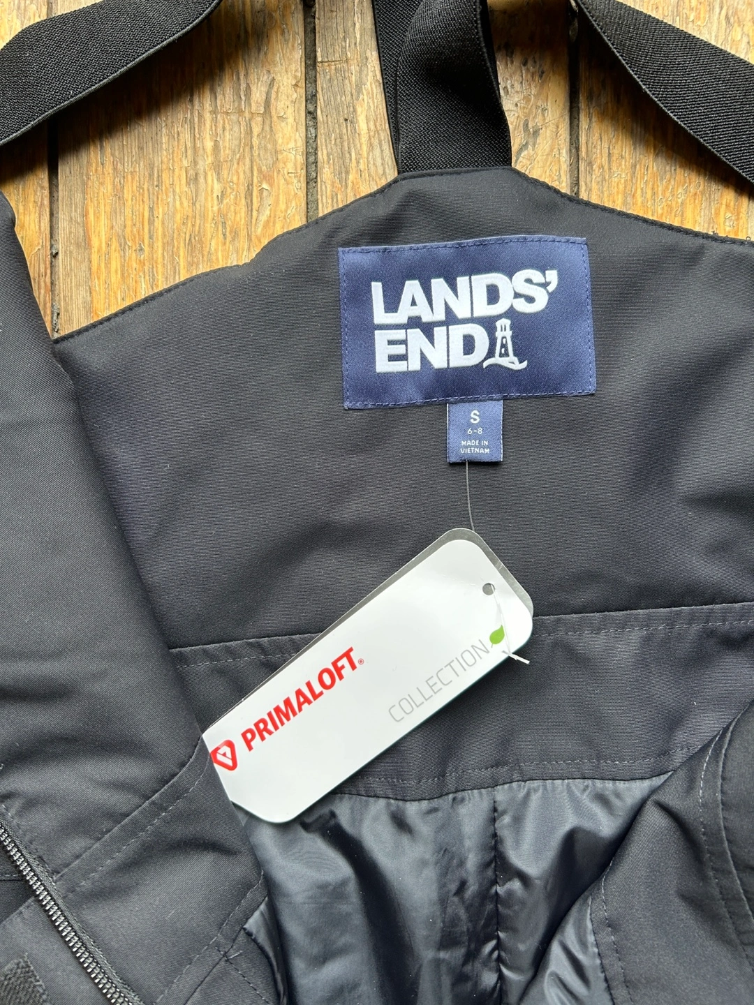 Lands' End snow bibs in size S (6-8). These bibs are black and feature PrimaLoft insulation to keep your little one warm and cozy during winter activities. Perfect for skiing, snowboarding, or just playing in the snow!