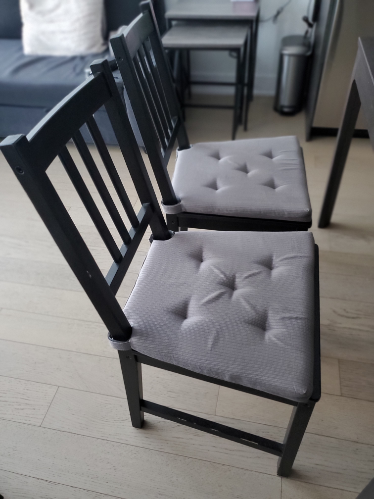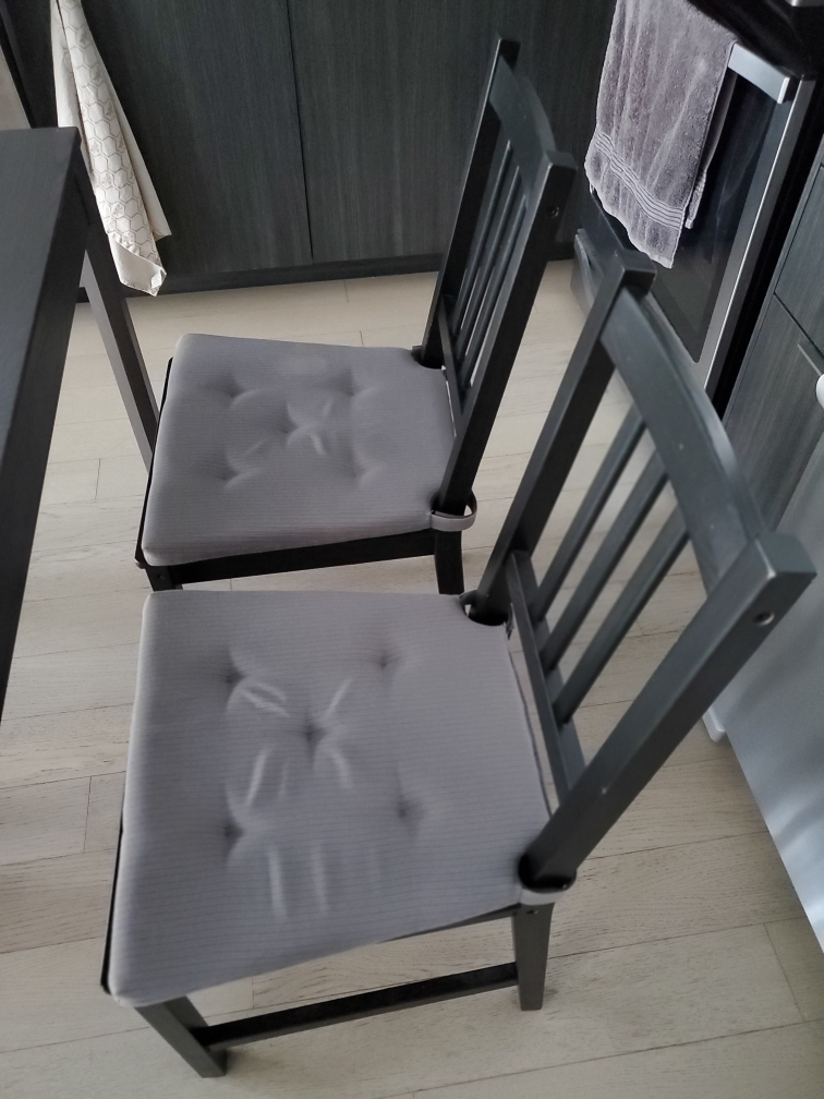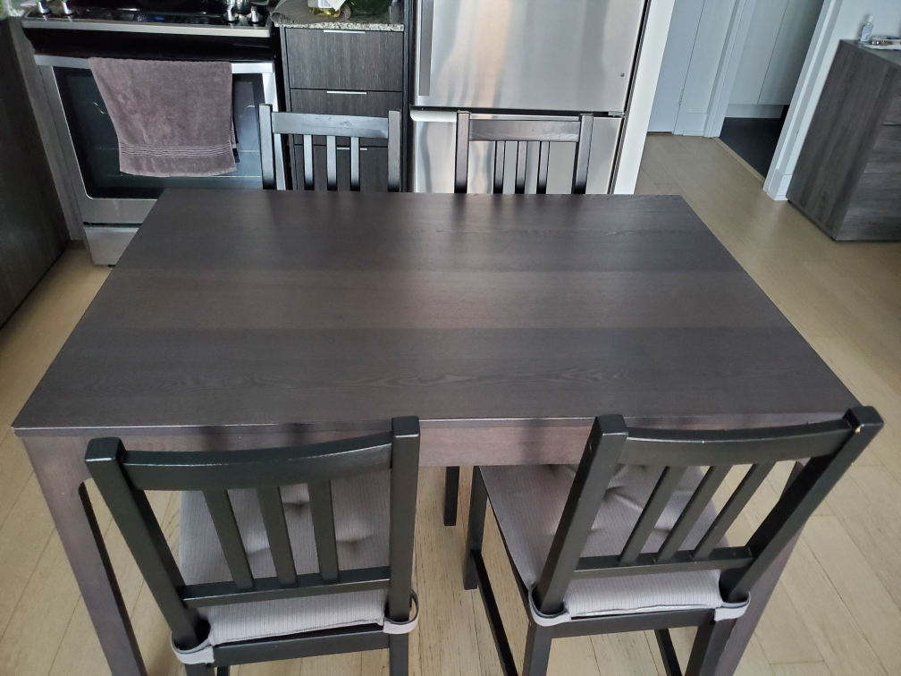 10Rustic black-brown IKEA dining table, chairs and seat cushions for sale (selling all items together no individual sales) Table Size: 130/190 (extended) x 80 cm