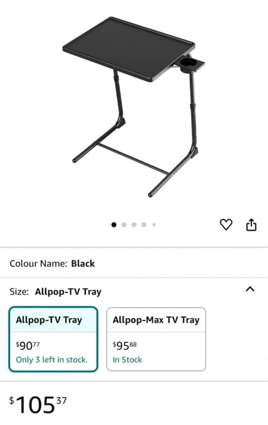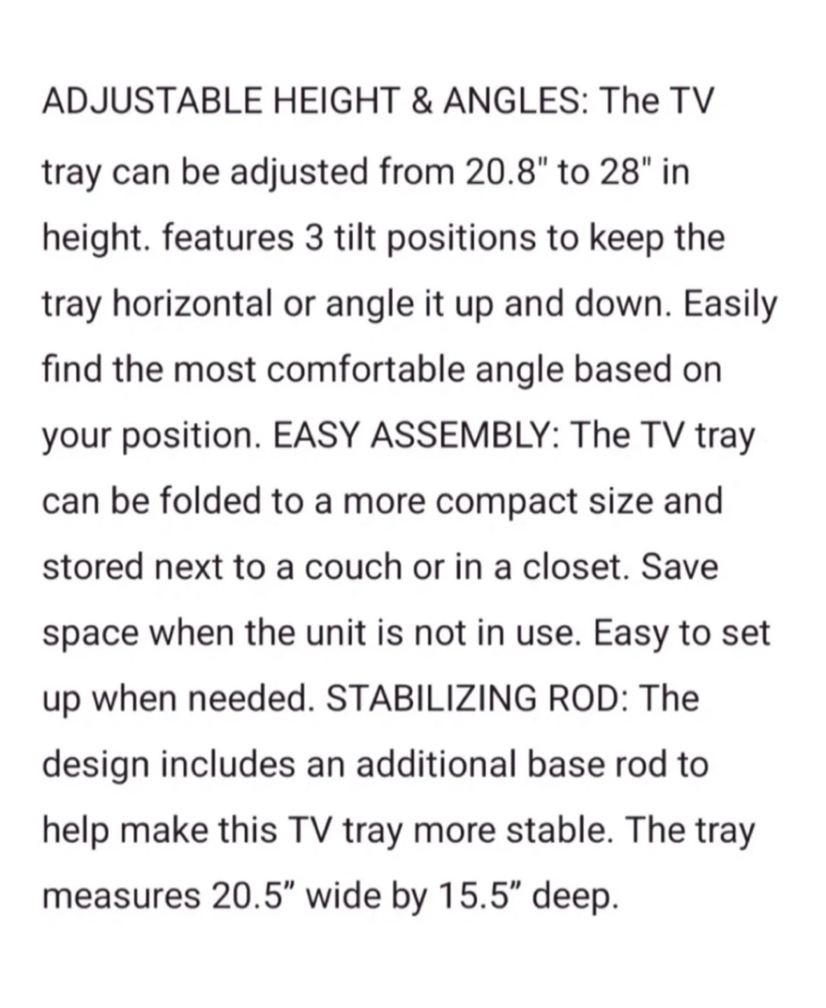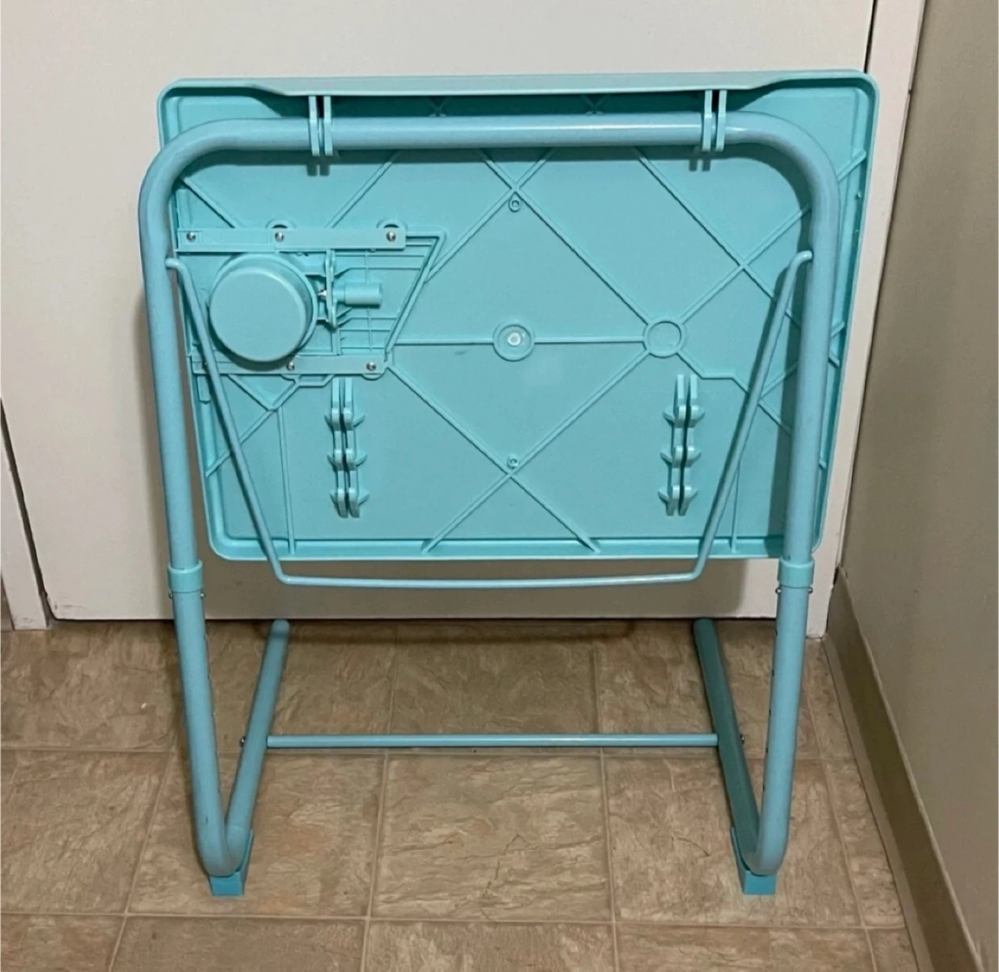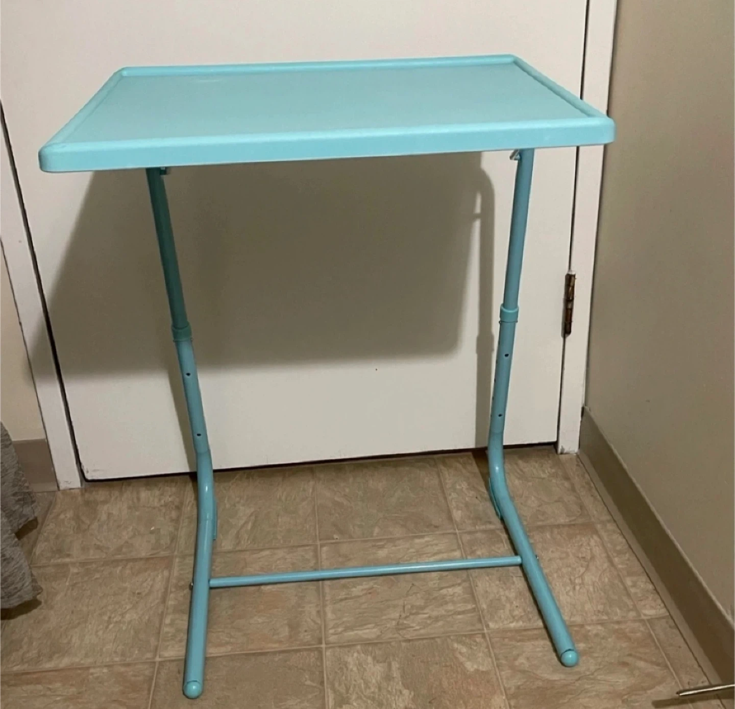 643Adjustable, portable, and foldable lap desk / TV tray table with a convenient built-in cup holder. Perfect for reading, studying, working, or enjoying a meal or a snack in bed or on sofa/couch. Rarely used. It’s in excellent condition like new. From smoke-free, pest-free, and pet-free home. Dimensions in Inches: 20.5” Wide x 15.5” Deep x 20.8” to 28” Adjustable Height Colour: Aqua / Light Blue. Adjustable height and angles. Features 3 tilt positions to keep the tray horizontal or angle it up and down. The tray can be folded to a more compact size and stored next to a couch, under the bed, or in a closet to save space when it’s not in use. The design includes an additional base rod to help make this tray more stable. The tray measures 20.5” wide and 15.5” deep (inches), and can be adjusted from 20.8” to 28” (inches) in height. Cash and pick up only. **Feel free to check my other listings** **Important Notes** 1) The Karrot platform operates on a "final sale" basis, meaning buyers are responsible for their purchases. No returns, and no refund once the purchase is finalized. 2) Buyers are encouraged to carefully check the item descriptions and dimensions before contacting the seller to show their interest. 3) Buyers are advised to inspect the item before finalizing the purchase.